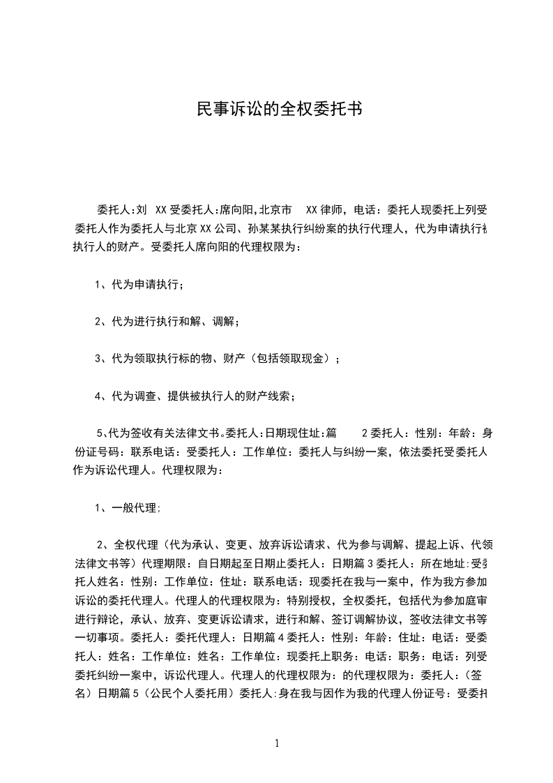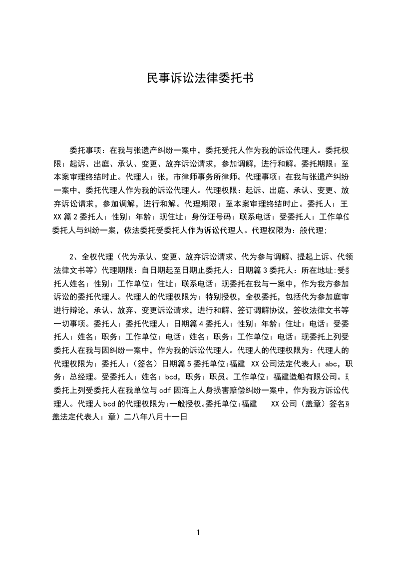2、全权代理(代为承认、变更、放弃诉讼请求、代为参与调解、提起上诉、代领法律文书等)