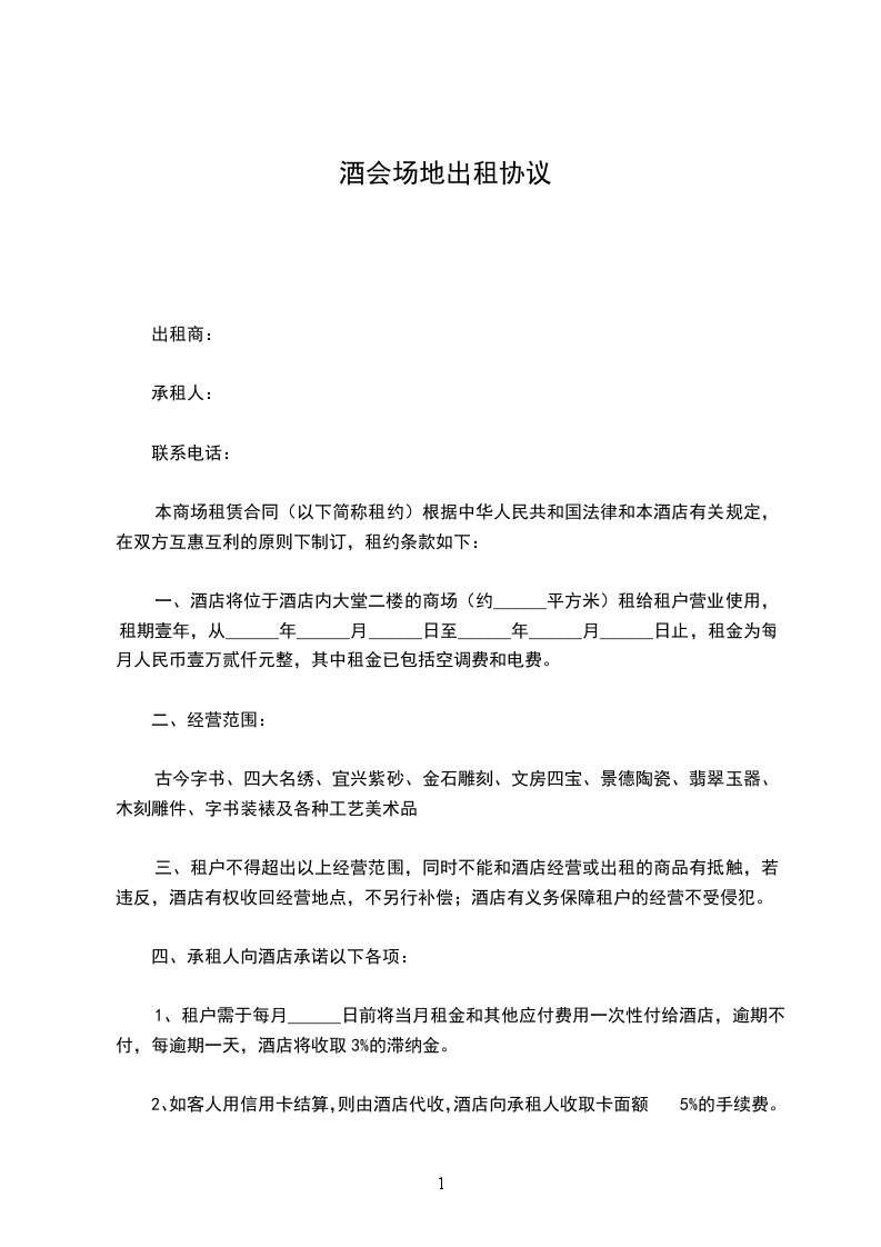 一、酒店将位于酒店内大堂二楼的商场(约______平方米)租给租户营业使用,租期壹年,从______年______月______日至______年______月______日止,租金为每月人民币壹万贰仟元整,其中租金已包括空调费和电费。