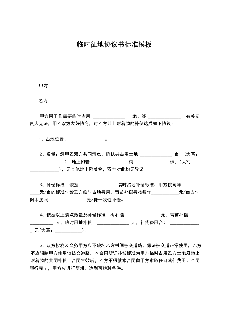 3、补偿标准:依据 ______________ 临时占地补偿标准,甲方按每年____________元/亩的标准付给乙方临时占地费用,青苗补偿费按每年____________元/亩支付, 树木按照 ______________ 元/株一次性补偿。