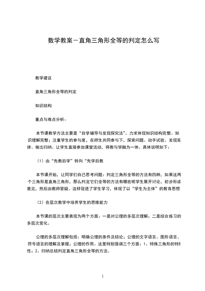 本节课开始,让同学们自己思考问题:判定三角形全等的方法有四种,如果这两个三角形是直角三角形,那么判定它们全等的方法有哪些呢学生展开讨论,初步形成意见,然后由教师答疑。这样促进了学生学习,体现了以“学生为主体”的教育思想。