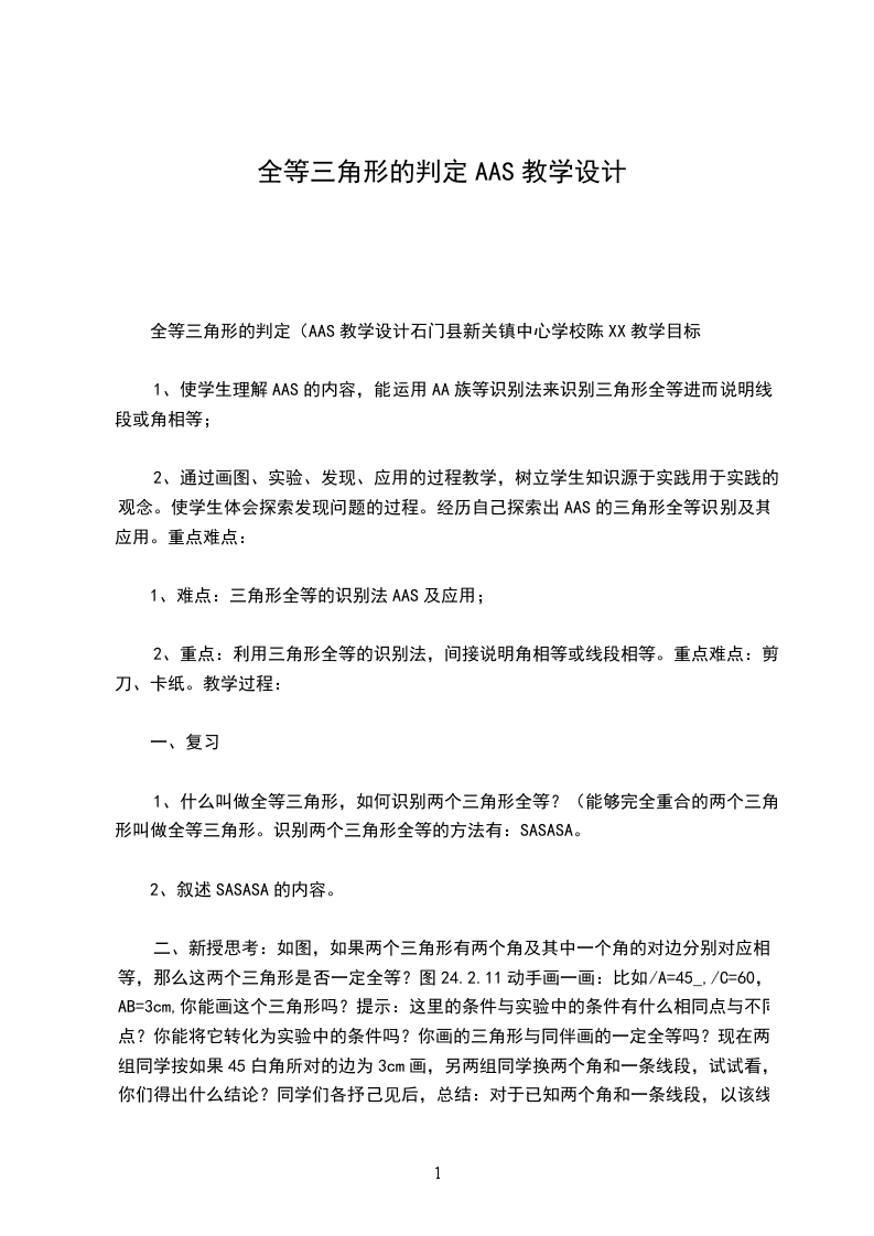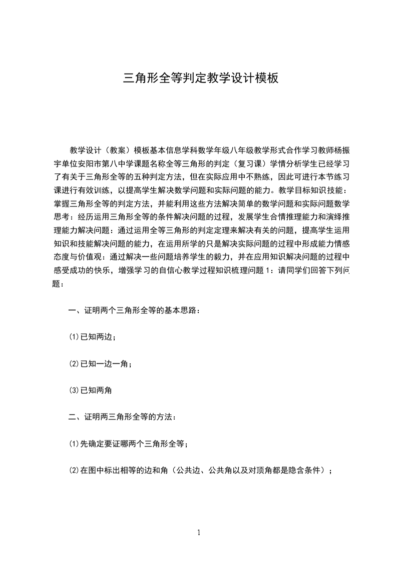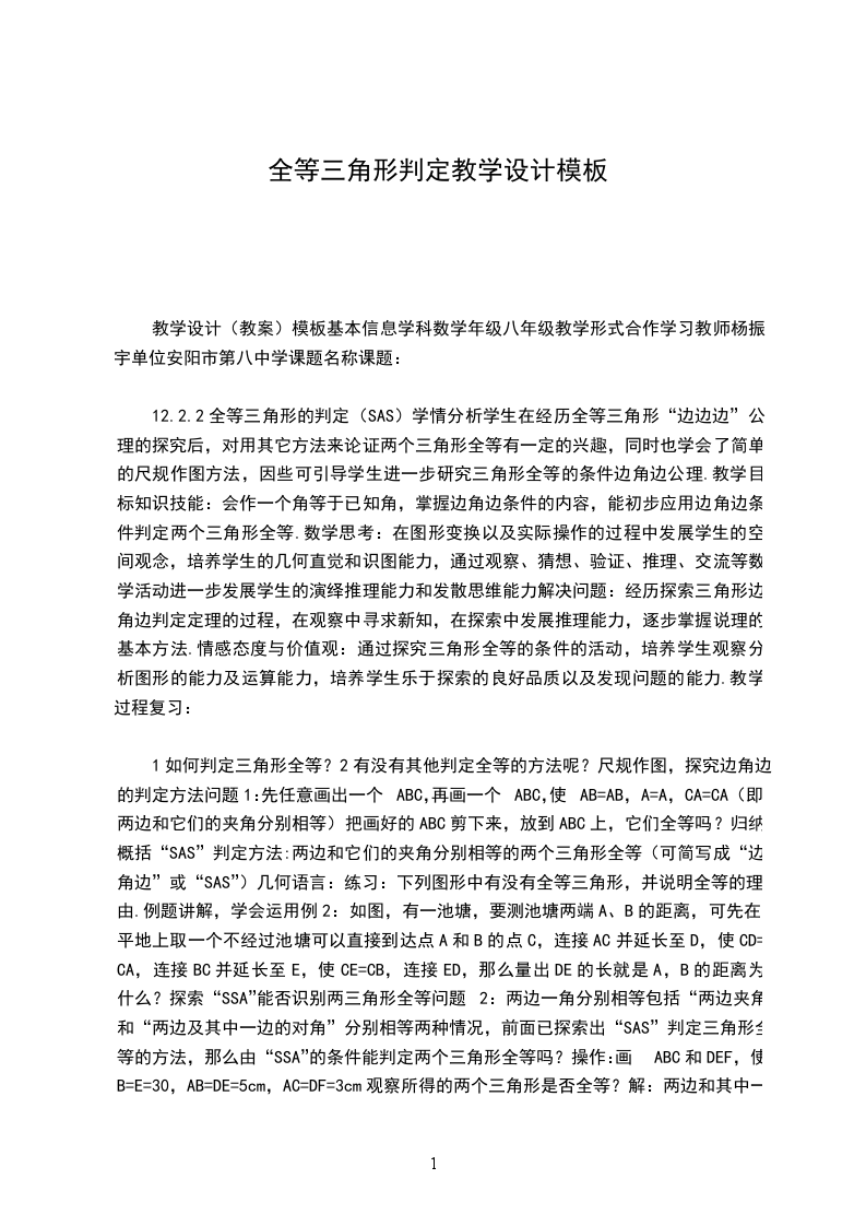 教学重点:SSS公理、灵活地应用学过的各种判定方法判定三角形全等。