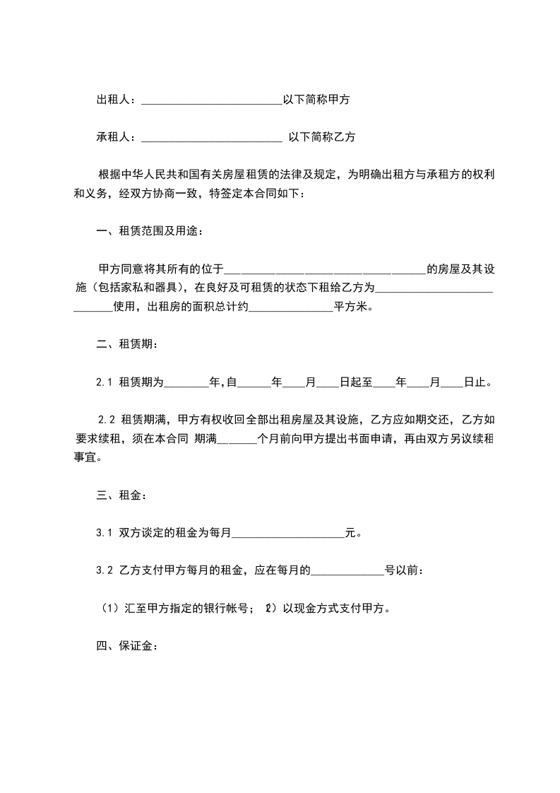 2.2 租赁期满,甲方有权收回全部出租房屋及其设施,乙方应如期交还,乙方如要求续租,须在本合同 期满_______个月前向甲方提出书面申请,再由双方另议续租事宜。