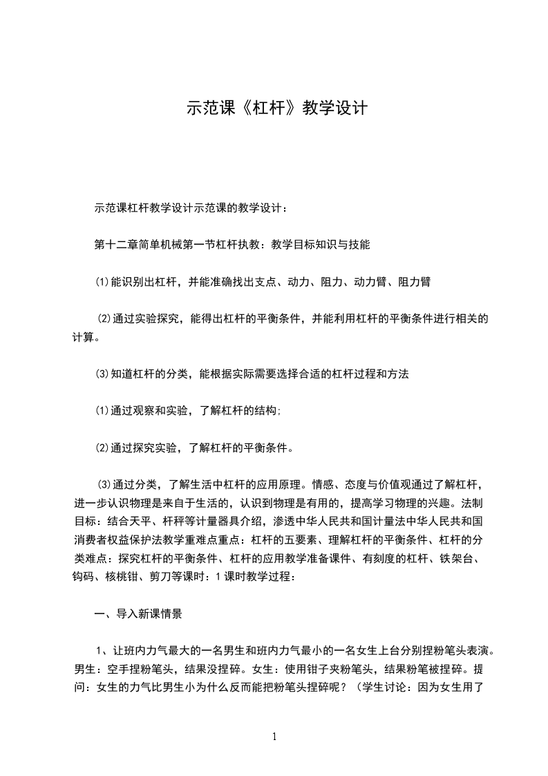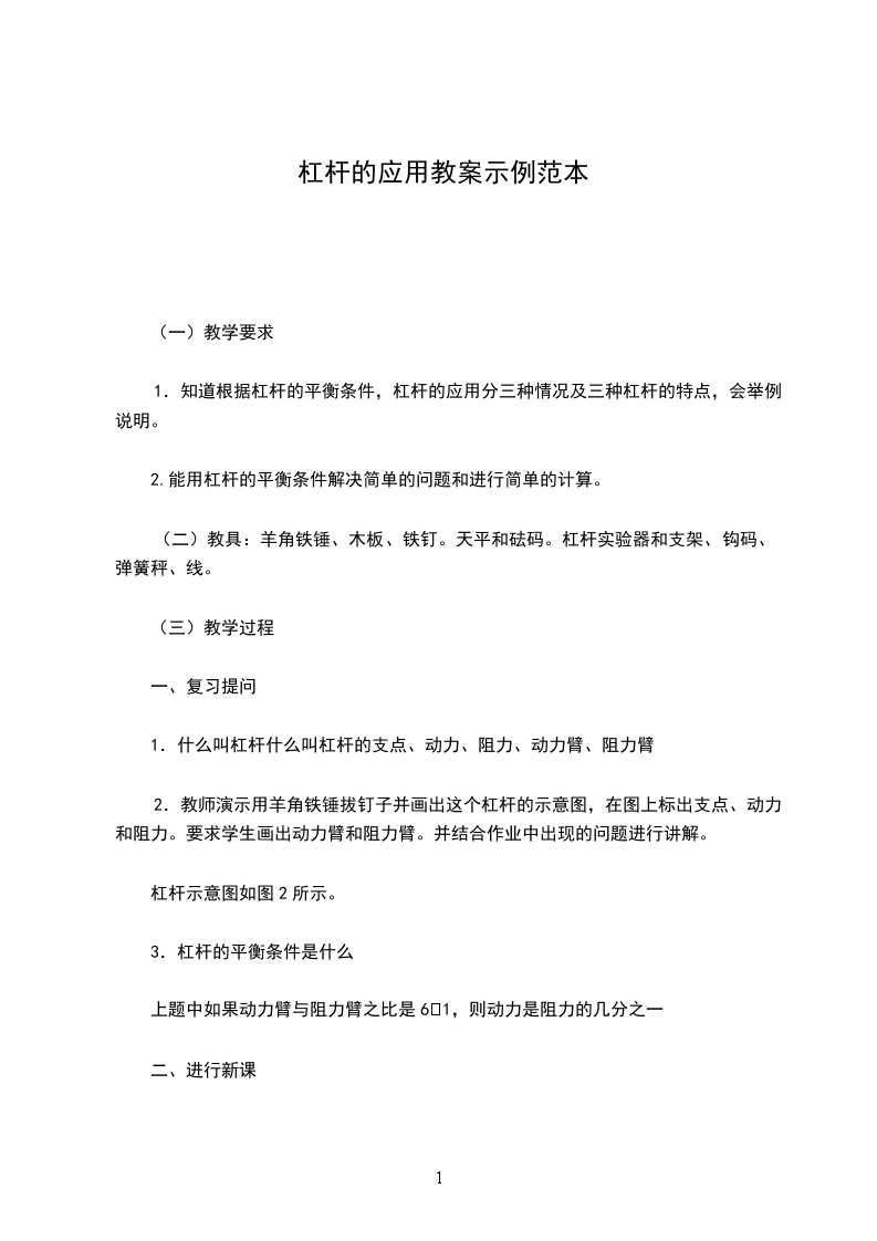 (二)教具:羊角铁锤、木板、铁钉。天平和砝码。杠杆实验器和支架、钩码、弹簧秤、线。