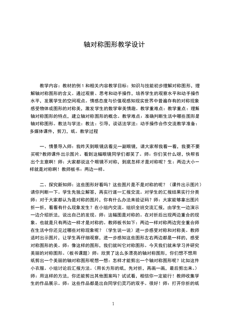 1、联系生活中的具体物体,通过观察和动手操作,使学生初步体会生活中的对称现象,认识轴对称图形的一些基本特征。