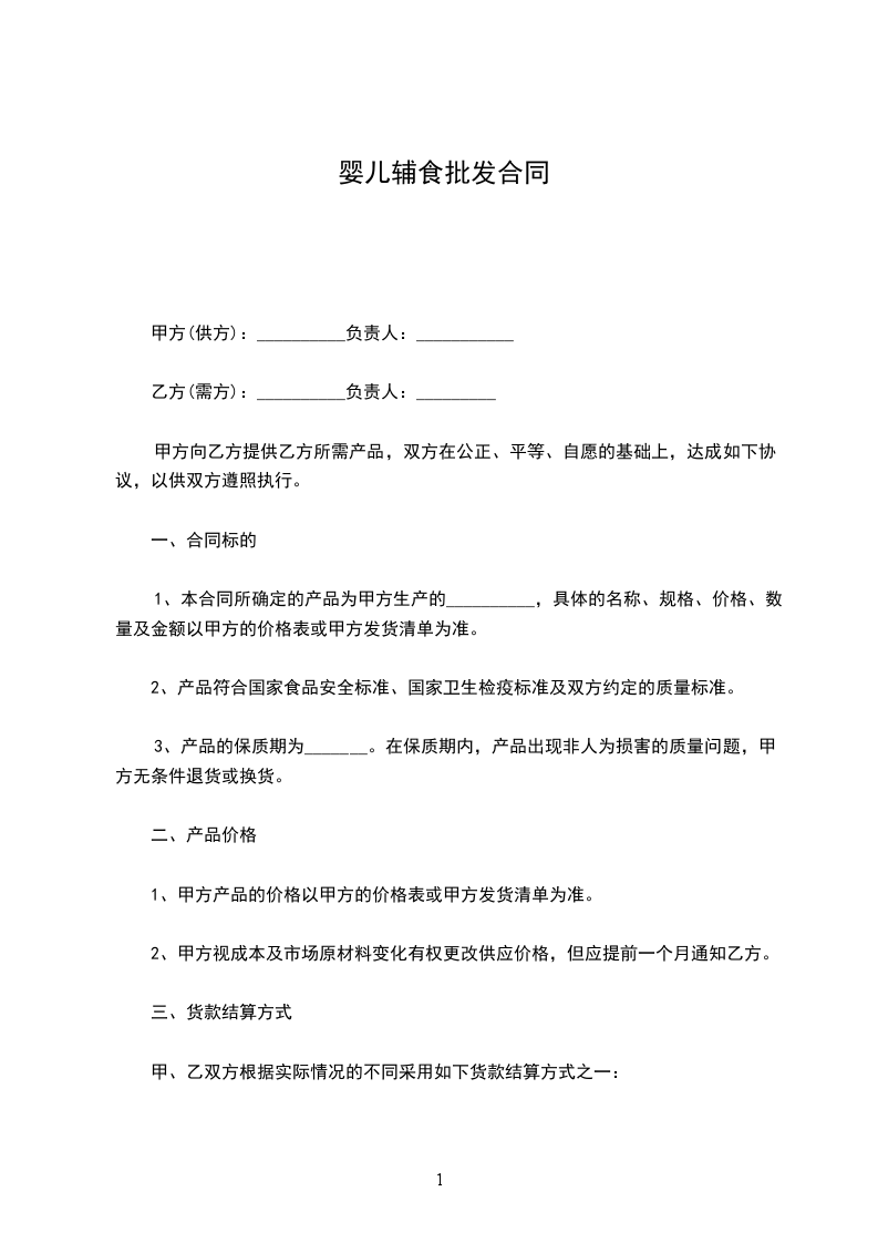 1、本合同所确定的产品为甲方生产的__________,具体的名称、规格、价格、数量及金额以甲方的价格表或甲方发货清单为准。