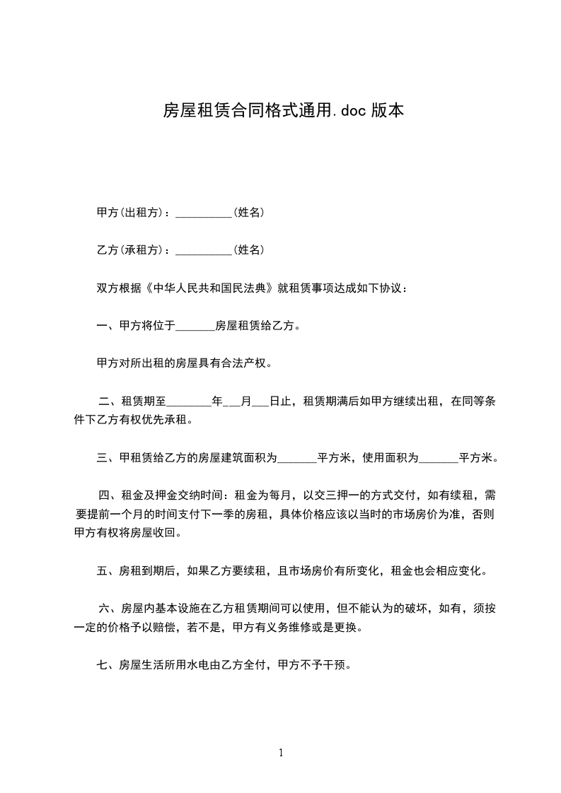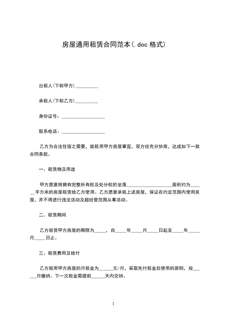 乙方为合法住宿之需要,就租用甲方房屋事宜,双方经充分协商,达成如下一致合同条款。