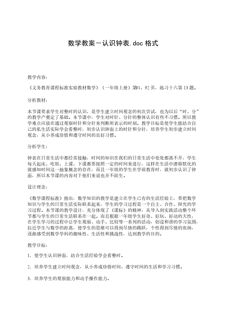 1、借助已有的生活经验,在熟悉的生活情境中交流、合作,学会认识整时与几时半,初步建立时间观念。