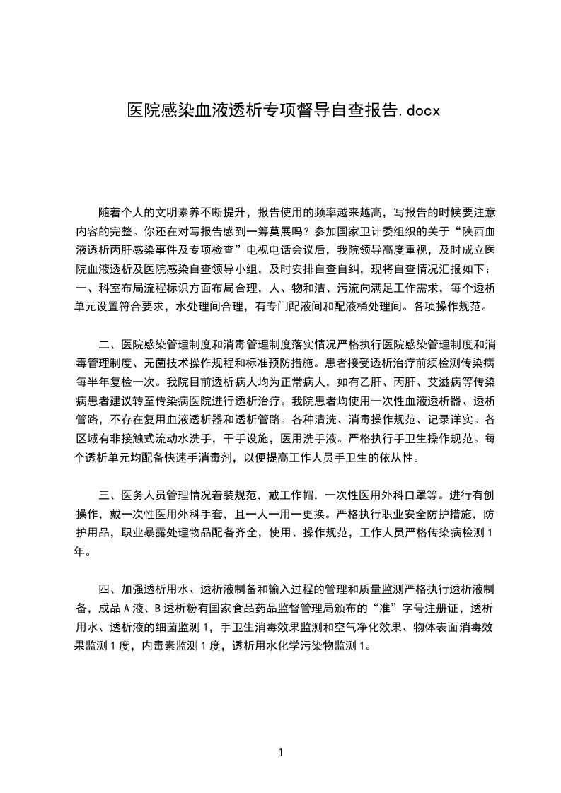 我院血液净化室各种设备及附属设施、人员等已全部到位,根据__市卫生局文件:运市卫函字【20__】19号文件精神,2___年5月8日由我院设备科牵头,县卫生局医政股对我院透析室进行自查,现将自查结果汇报如下: