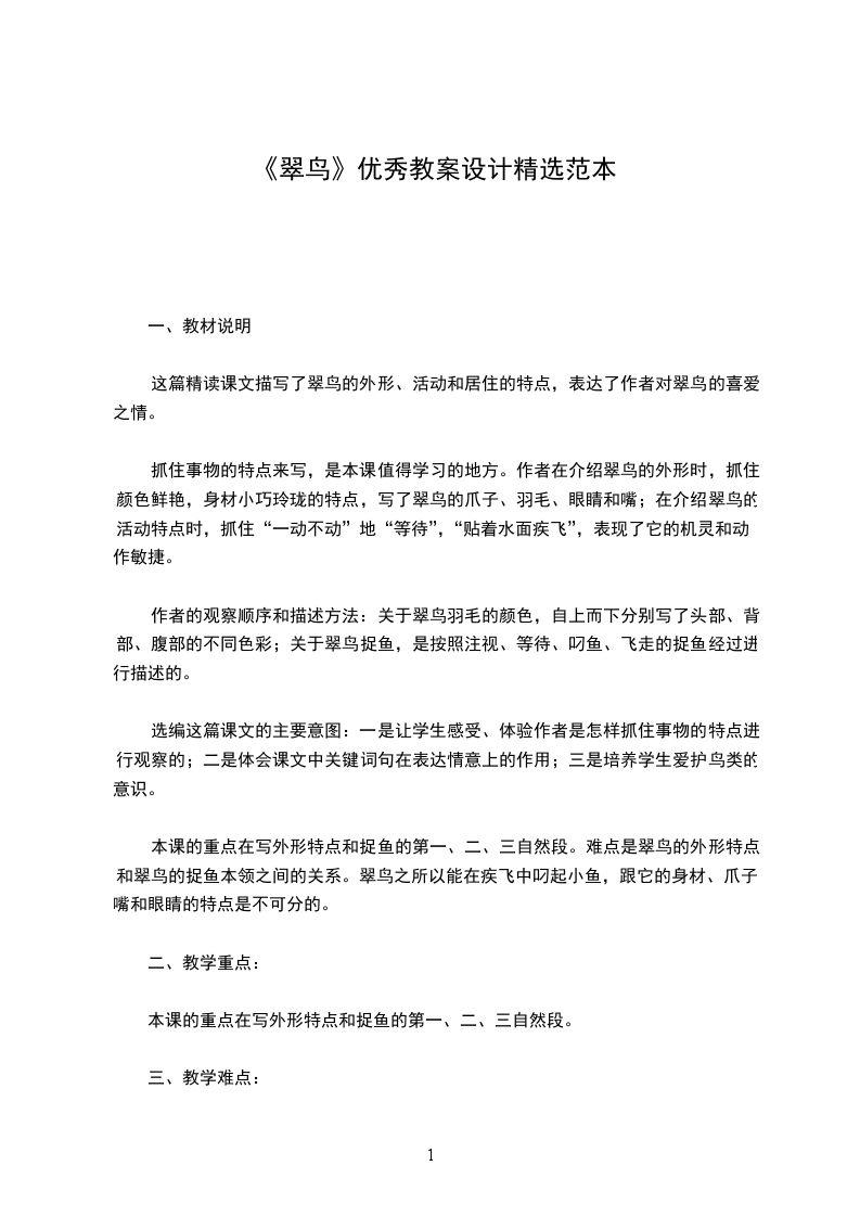 本课的重点在写外形特点和捉鱼的第一、二、三自然段。难点是翠鸟的外形特点和翠鸟的捉鱼本领之间的关系。翠鸟之所以能在疾飞中叼起小鱼,跟它的身材、爪子、嘴和眼睛的特点是不可分的。