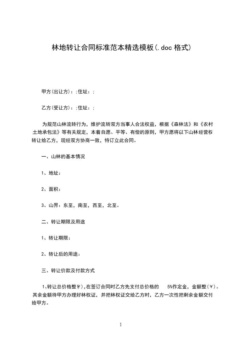 为规范山林流转行为,维护流转双方当事人合法权益,根据《森林法》和《农村土地承包法》等有关规定,本着自愿、平等、有偿的原则,甲方愿将以下山林经营权转让给乙方,现经双方协商一致,特订立此合同。