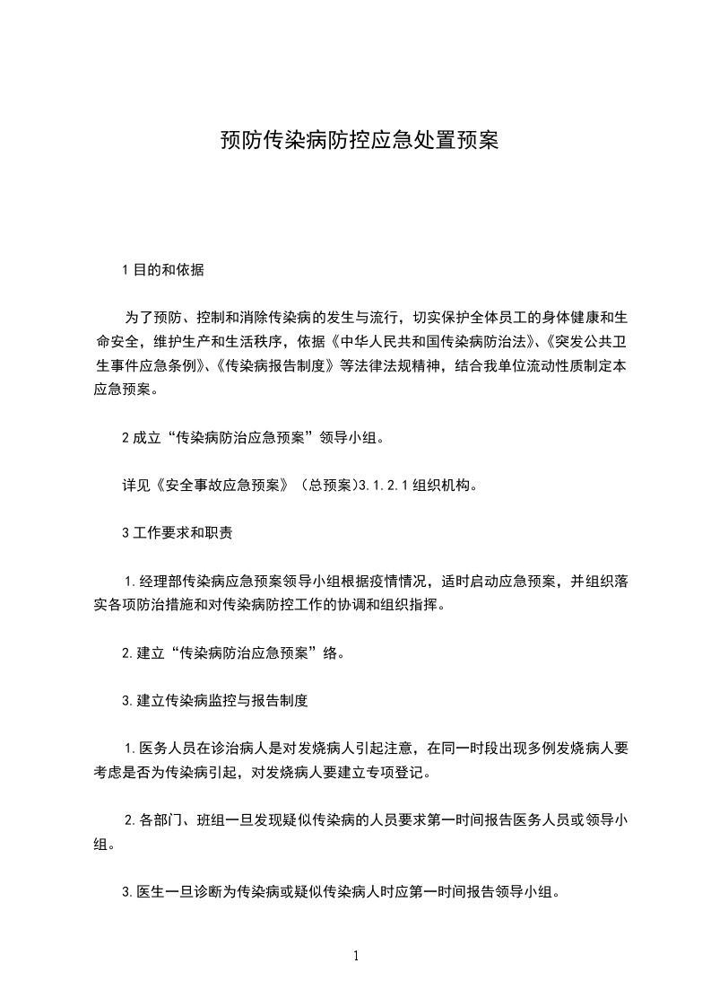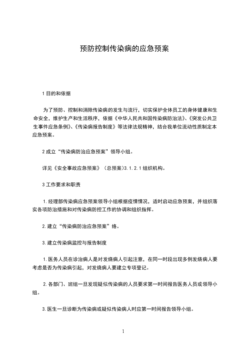 为了预防、控制和消除传染病的发生与流行,切实保护全体员工的身体健康和生命安全,维护生产和生活秩序,依据《中华人民共和国传染病防治法》、《突发公共卫生事件应急条例》、《传染病报告制度》等法律法规精神,结合我单位流动性质制定本应急预案。
