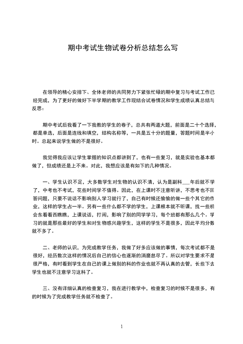 一、学生认识不足,大多数学生对生物的认识不清,认为是副科___年后就不学了,中考也不考试,花些时间学不值得。因此,在上课时不注意听讲,不思考也不回答问题,只要不说话不影响别人学习就行了,自己有时候还偷偷的做一些个其它的作业,这样的学生占一半。另有一些什么都不学的学生,上课根本就不听课,找一些机会东看看西瞧瞧,上课说话,打闹,影响了别的同学学习,每个班都有那么几个。学习的就是那些最好的学生和对生物感兴趣学生,这样的学生不是很多,因此平均分数就不多了。