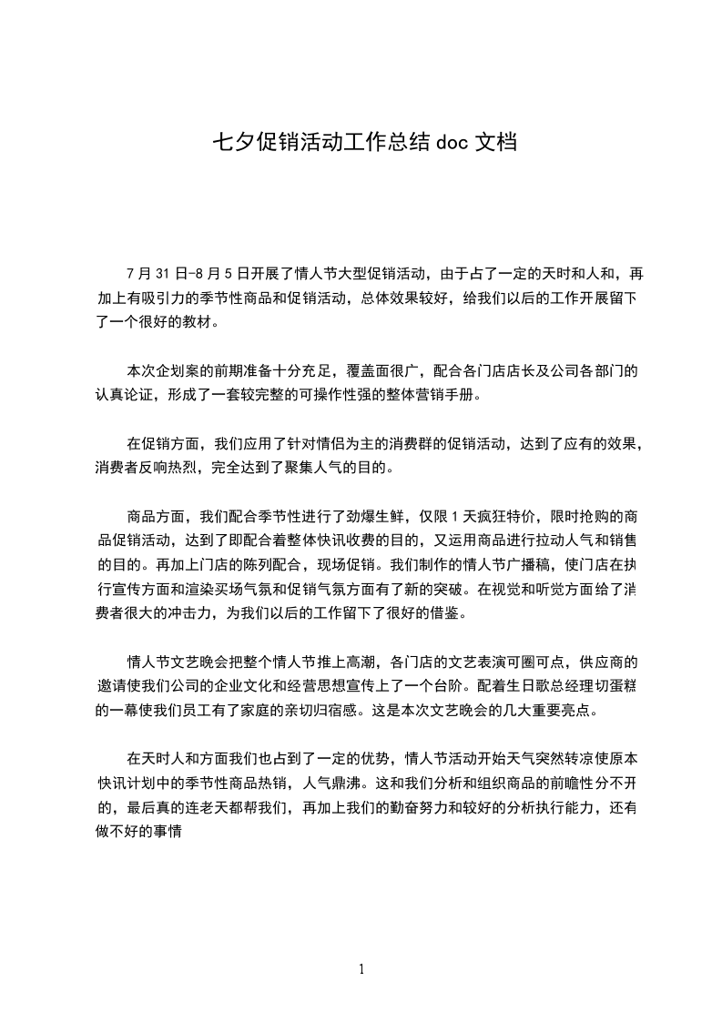 7月31日-8月5日开展了情人节大型促销活动,由于占了一定的天时和人和,再加上有吸引力的季节性商品和促销活动,总体效果较好,给我们以后的工作开展留下了一个很好的教材。