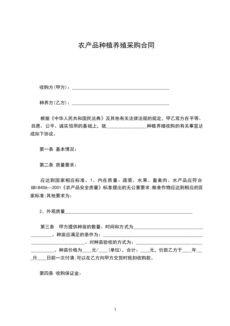 根据《中华人民共和国民法典》及其他有关法律法规的规定,甲乙双方在平等、自愿、公平、诚实信用的基础上,就_________________种植养殖收购的有关事宜达成如下协议。