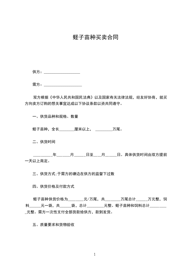 蛏子苗种供货价格为________元/万尾,共________万尾总计______万元整,饲料______元一袋,共______袋,总计_________元整。蛏子苗种和饲料总计__________元整。需方一次性支付全部货款给供方,款到发货。