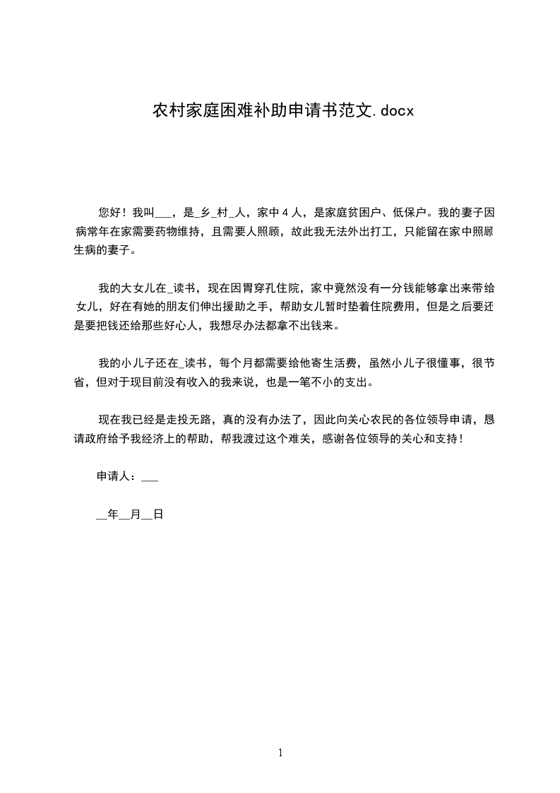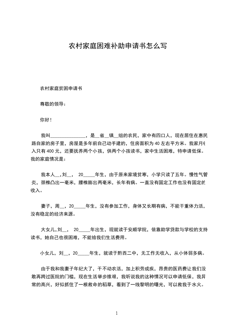 我叫_______________,是__省__镇__组的农民,家中有四口人,现在居住在惠民路自家的房子里,房屋是多年前自己动手建的,住房面积为40左右平方米。我家月收入只有400元,还要抚养两个小孩,供两个小孩读书,家中生活困难,特申请低保。我的家庭情况是: