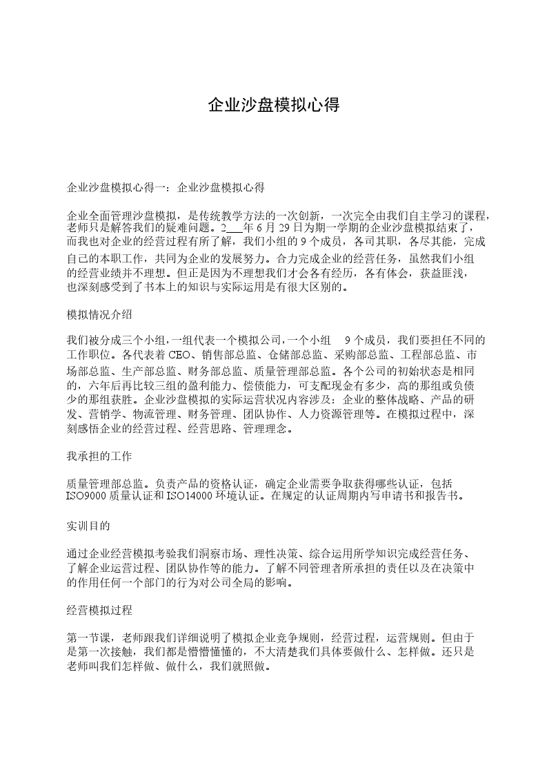 企业沙盘模拟通过直观的企业经营沙盘,来模拟企业运行状况。让我们在分析市场、制定战略、组织生产、整体营销和财务结算等一系列活动中体会企业经营运作的全过程,认识到企业资源的有限性。既能调动我们的主观能动性,又可以让我们身临其境,真正感受一个企业经营者直面的市场竞争的精彩与残酷,承担的经营风险与责任,从而深刻理解企业的管理思想,领悟科学的管理规律,提升管理能力。