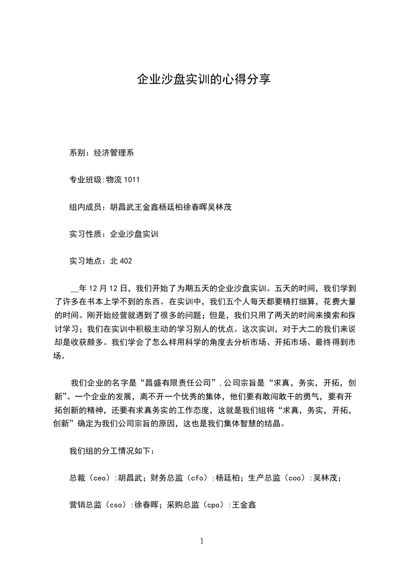我们企业的名字是“昌盛有限责任公司”,公司宗旨是“求真,务实,开拓,创新”。一个企业的发展,离不开一个优秀的集体,他们要有敢闯敢干的勇气,要有开拓创新的精神,还要有求真务实的工作态度,这就是我们组将“求真,务实,开拓,创新”确定为我们公司宗旨的原因,这也是我们集体智慧的结晶。