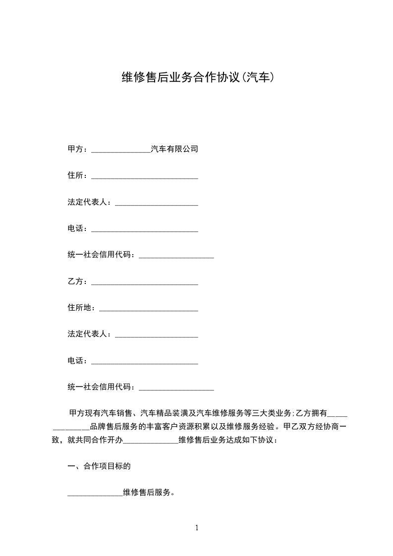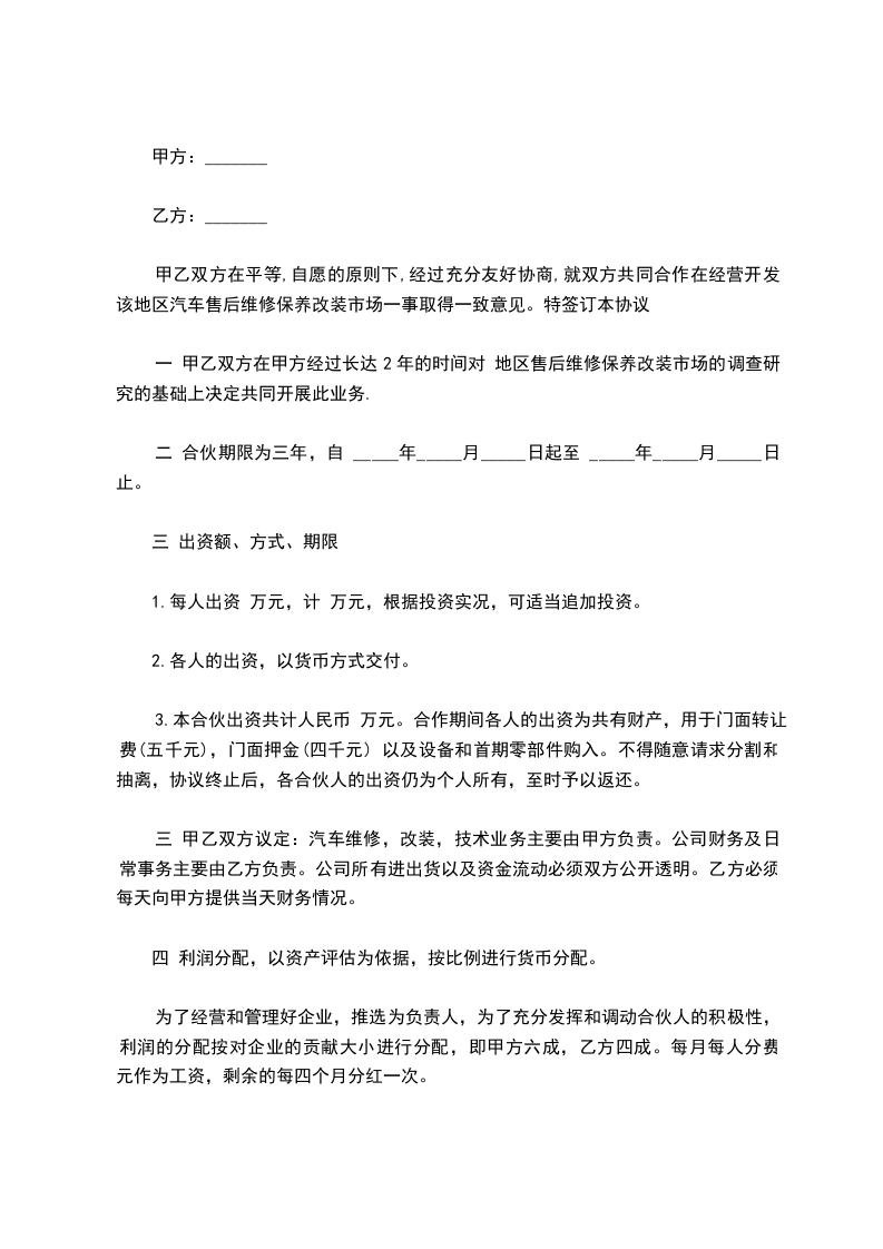 甲方现有汽车销售、汽车精品装潢及汽车维修服务等三大类业务;乙方拥有______________品牌售后服务的丰富客户资源积累以及维修服务经验。甲乙双方经协商一致,就共同合作开办______________维修售后业务达成如下协议:
