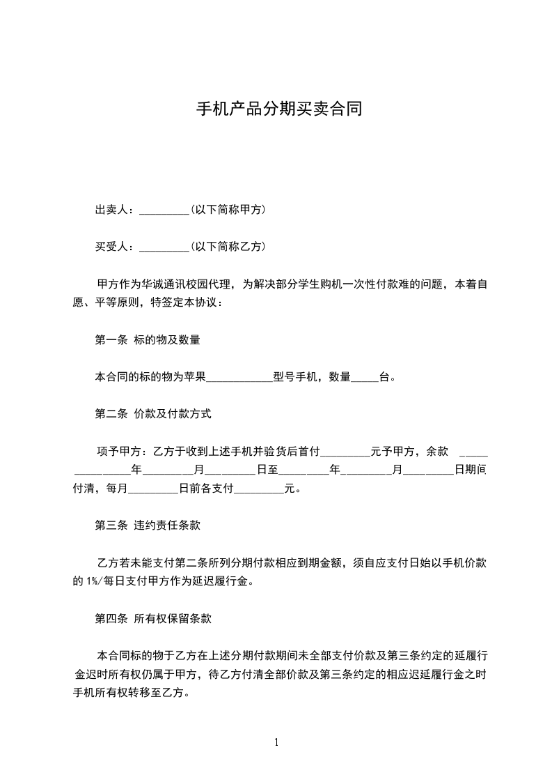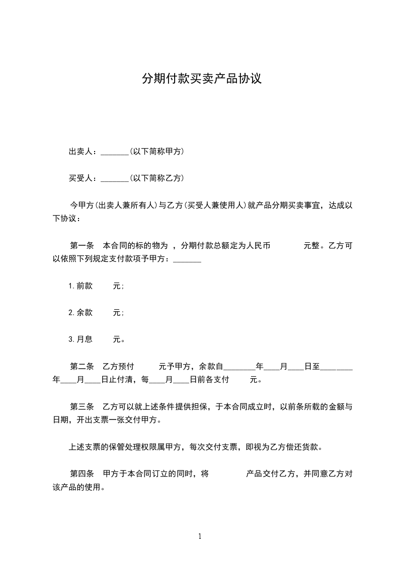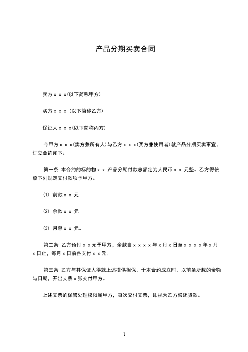 第一条 本合约的标的物x x 产品分期付款总额定为人民币x x 元整。乙方得依照下列规定支付款项予甲方。
