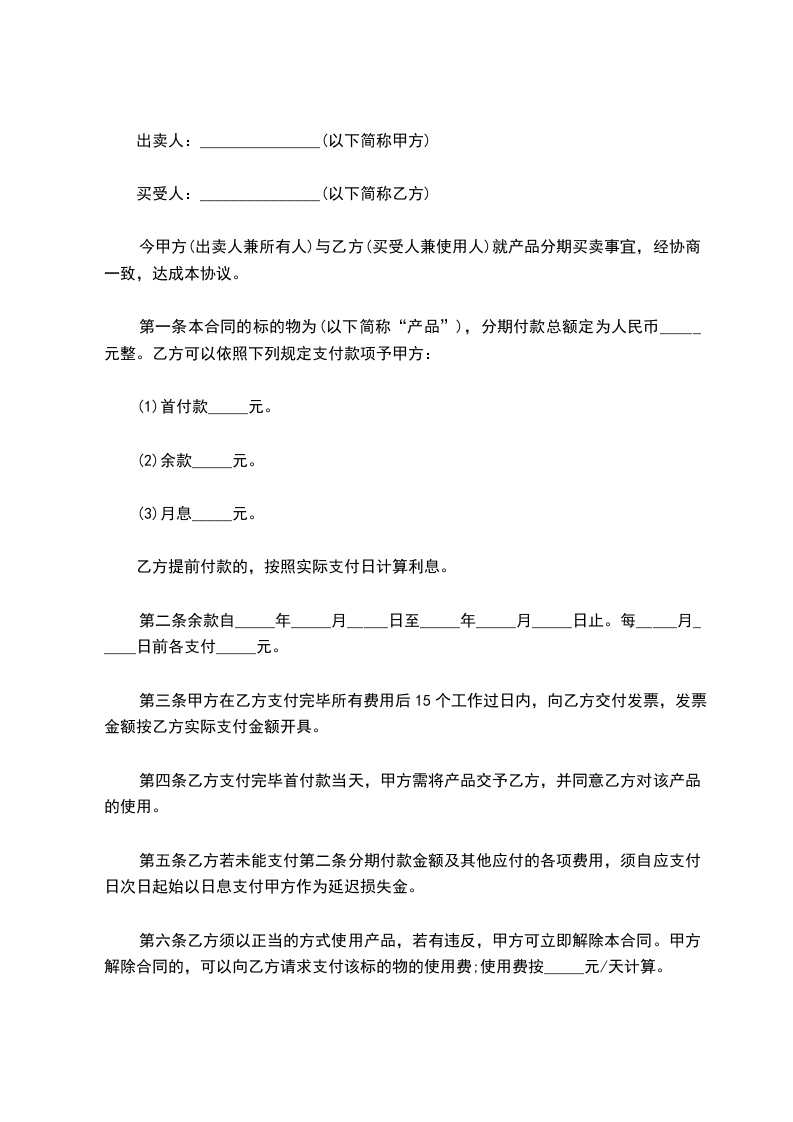 今甲方x x x(卖方兼所有人)与乙方x x x(买方兼使用者)就产品分期买卖事宜,订立合约如下: