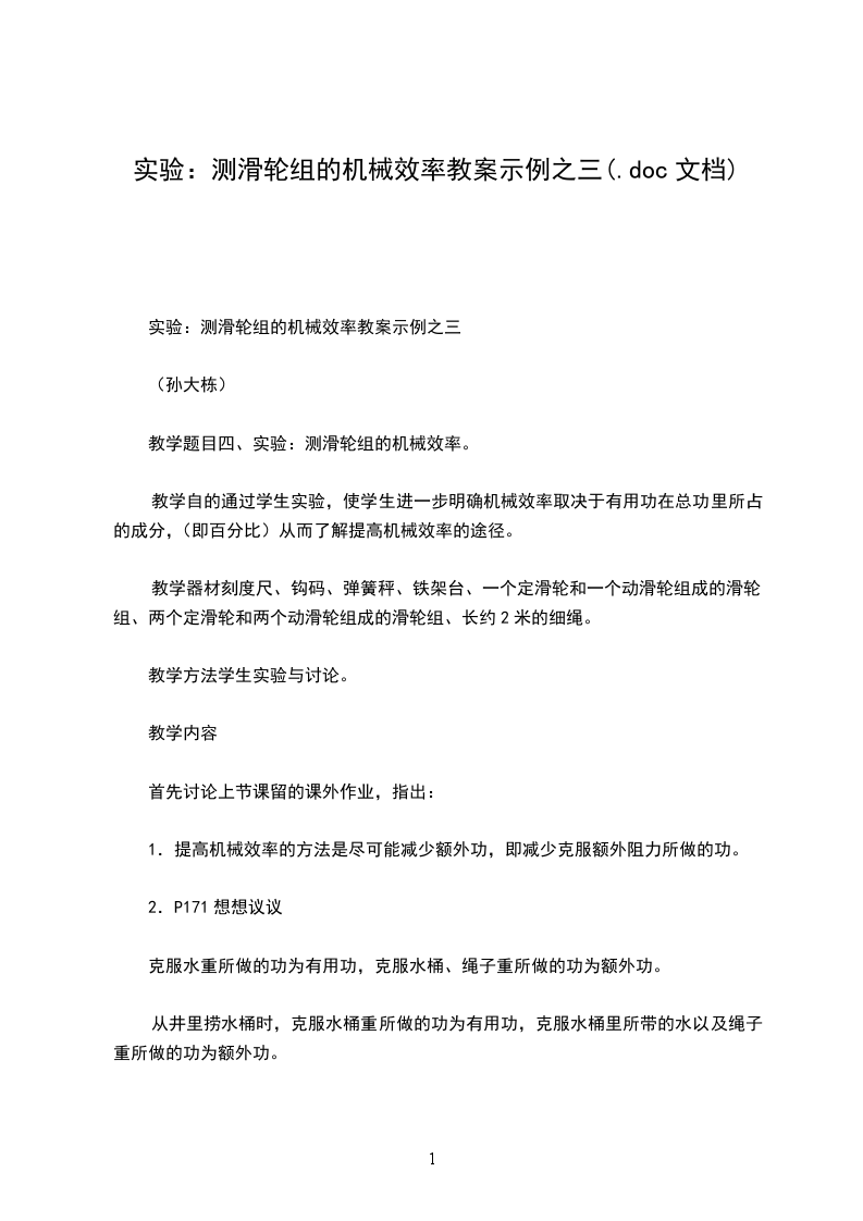 引言:本节课我们要通过测滑轮的机械效率,要进一步明确决定机械效率的两个条件,通过几个不同的方法所测定的效率,进一步认识提高机械效率的实际意义。
