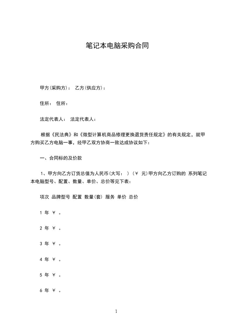 1、甲方向乙方订货总值为人民币(大写: ) (¥ 元)甲方向乙方订购的 系列笔记本电脑型号、配置、数量、单价、总价等见下表: