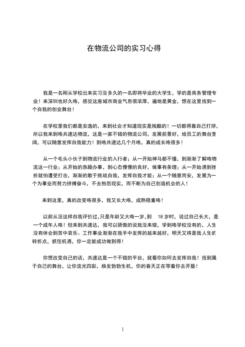 从一个毛头小伙子到物流行业的入行者;从一开始神马都不懂,到渐渐了解咯物流这一行业;从开始的急躁办事,到心态慢慢的良好,做事有条理;从一开始遇到挫折就怕遭受打击,渐渐的敢于挑战自我,发挥自我才能;从一个随意而安,发展为一个为事业而努力拼搏奋斗,不去抱怨现实,而不断为自己创造机会的人!
