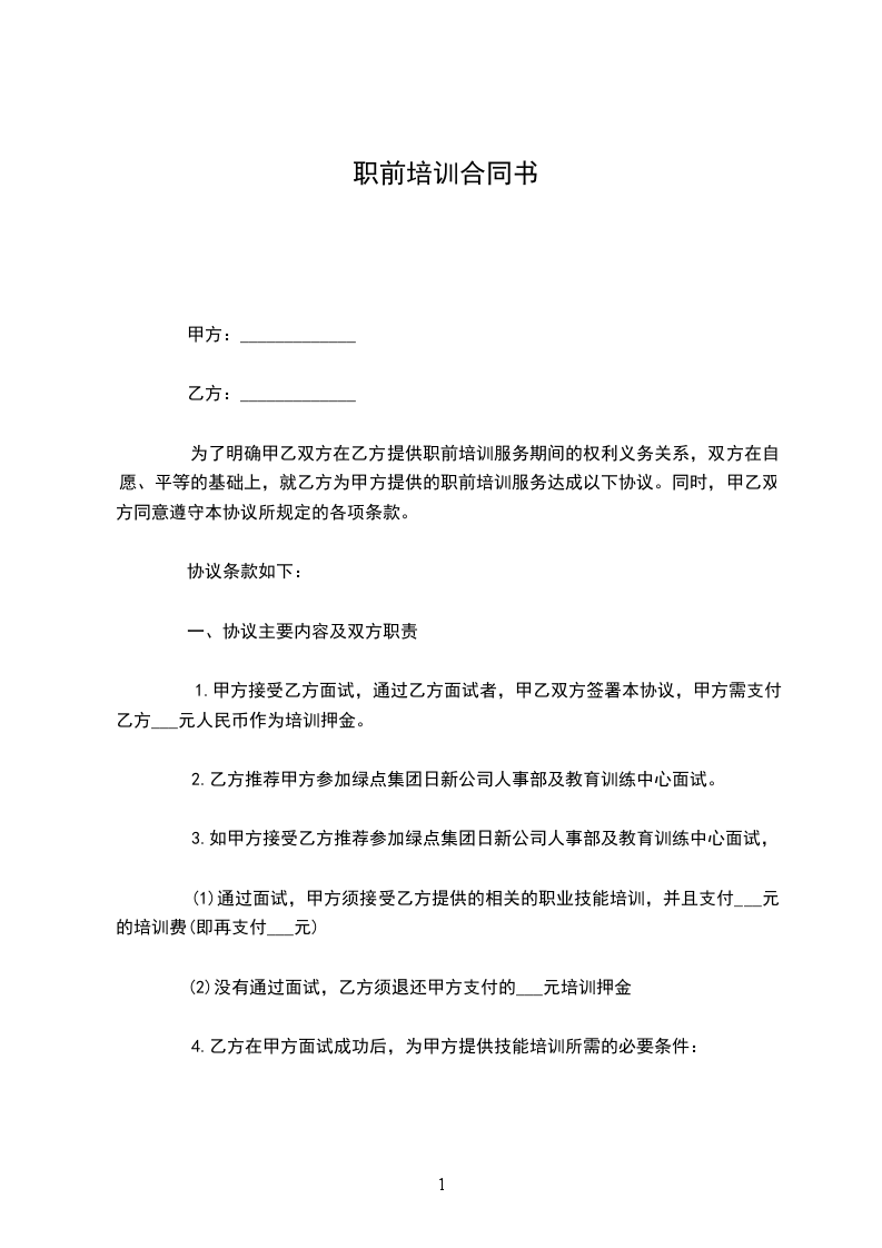 如果甲方违反本协议规定,在被绿点集团日新公司录用后,拒绝参加乙方提供的职前培训,乙方将不退还其 元培训押金并不提供该职位所需职业技能证明,后果由甲方承担。