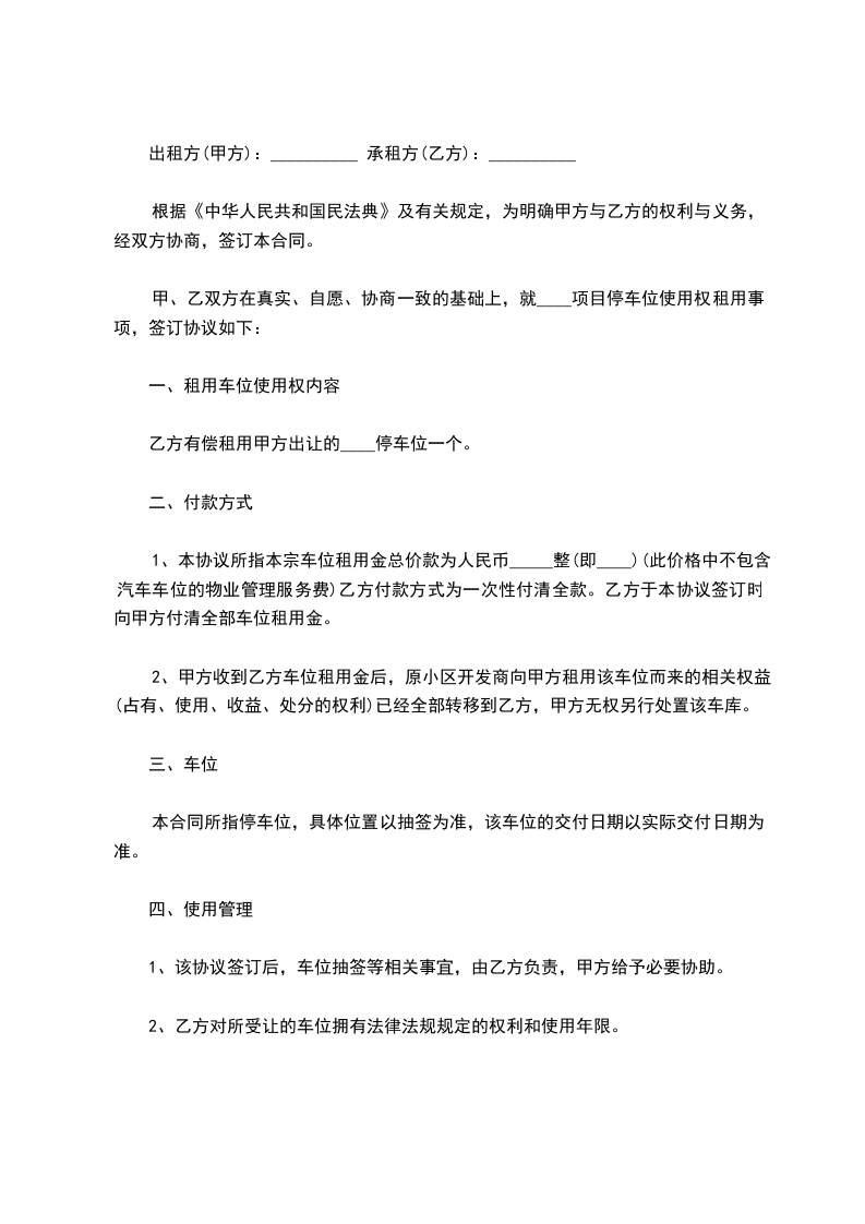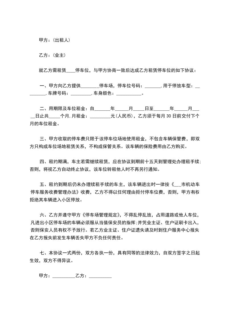 甲、乙双方根据平等、自愿、协商的原则就车位使用、车辆停放管理服务事宜达成如下协议。