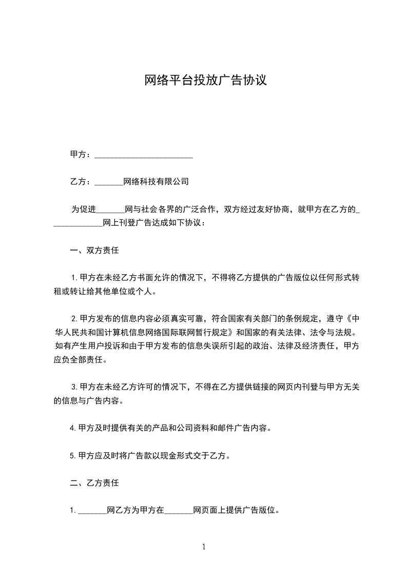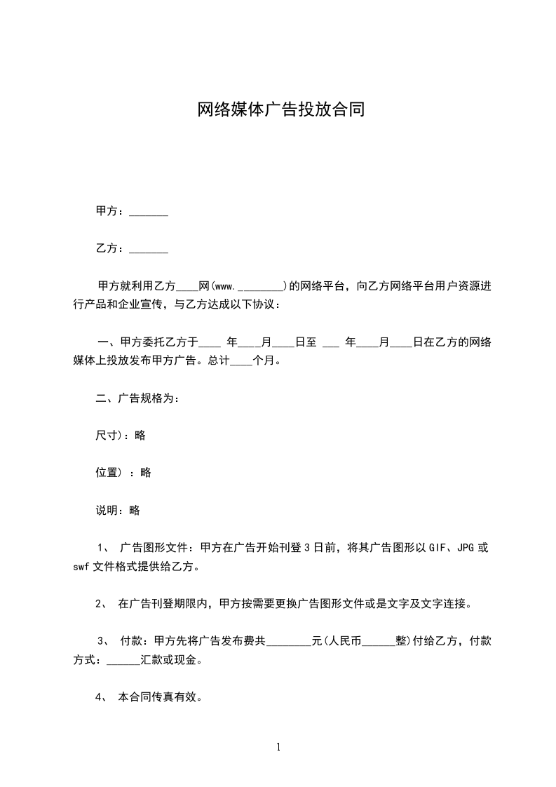 一、甲方委托乙方于____ 年____月____日至 ___ 年____月____日在乙方的网络媒体上投放发布甲方广告。总计____个月。