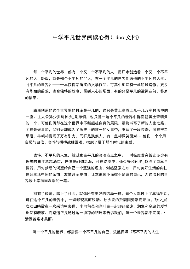 中学平凡的世界阅读心得3平凡,是生活的本色。我们每一个人,对于这个浩缈的世界来说,都十分渺小、脆弱、微不足道。这个世界也是平凡的,悲与欢、生与死、穷与富、世事的变更,于历史的长河来说,无非是些平凡事。对于平凡,我素来都是这样认为的,直到读了一本书——《平凡的世界》,这才恍然大悟。