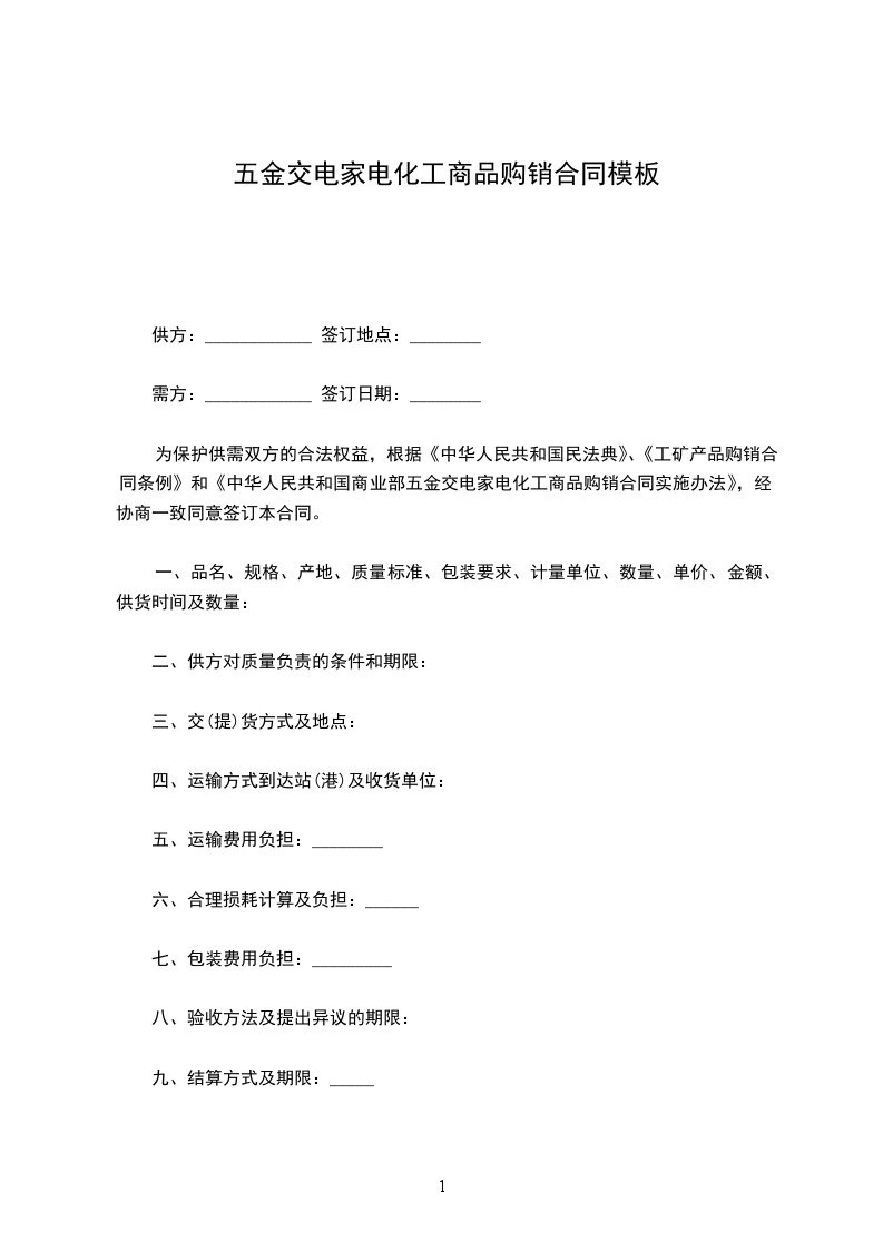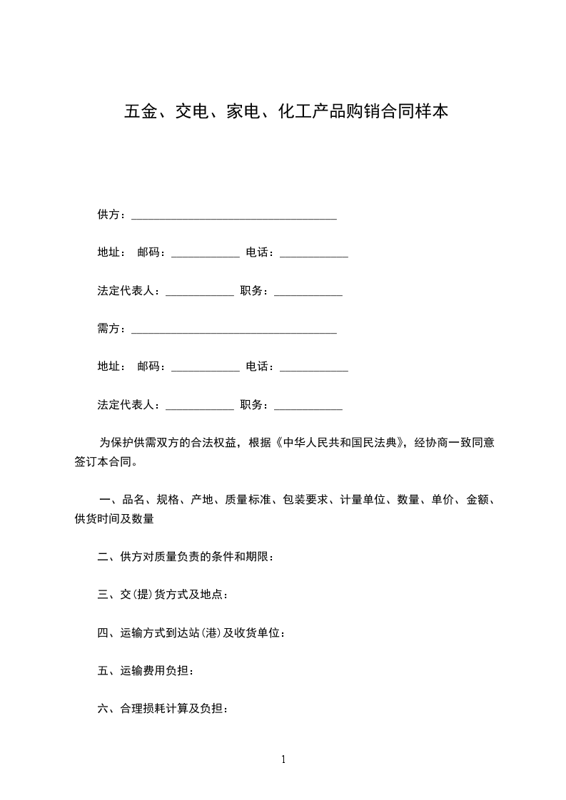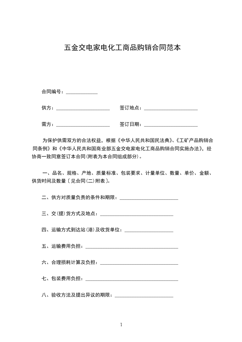 为保护供需双方的合法权益,根据《中华人民共和国民法典》、《工矿产品购销合同条例》和《中华人民共和国商业部五金交电家电化工商品购销合同实施办法》,经协商一致同意签订本合同(附表为本合同组成部分)。
