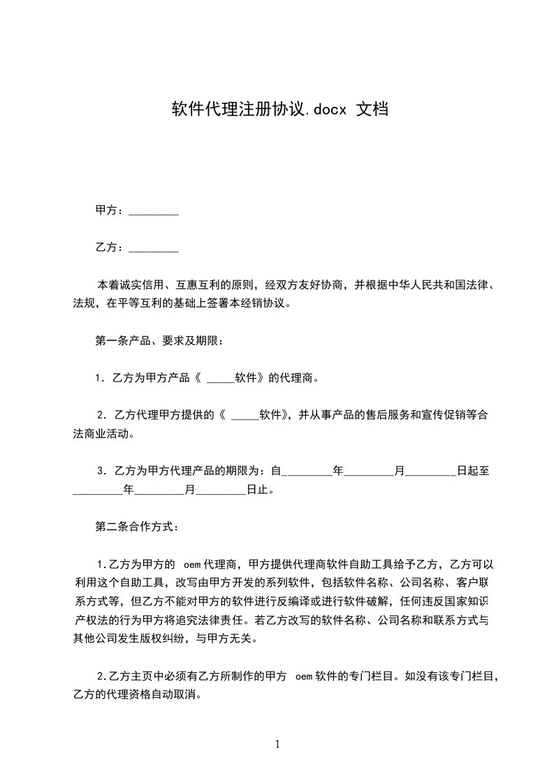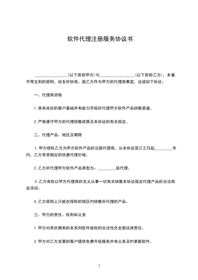 1.甲方授权乙方为甲方软件产品的注册代理商,从本协议签订之日起_________年内,乙方享受相应的优惠代理价格。