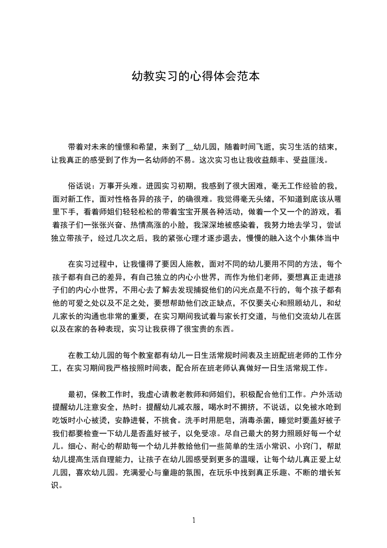 幼教工作是一个繁琐而又辛苦的事情,需要幼教工作者耐心、细心、爱心、责任心并重,缺一不可,总之,教师是一个崇高而神圣的职业,要当一名好幼教不容易啊~在此次实习中,我也看到了我自己不足之处,社会的不断进步使幼儿园对幼儿教师的要求是越来越高。我愿意用我的所有热情与爱心,换取孩子们的开心以及家长的诚心,实习间:让我增长了见识,做老师难,做个幼儿老师难上加难,我要在今后的工作中,不断的充实自己,全身心投入到未来的幼儿教育事业。这就是我这几个月的实习过曾,想要当一名好教师不容易。总之为了
