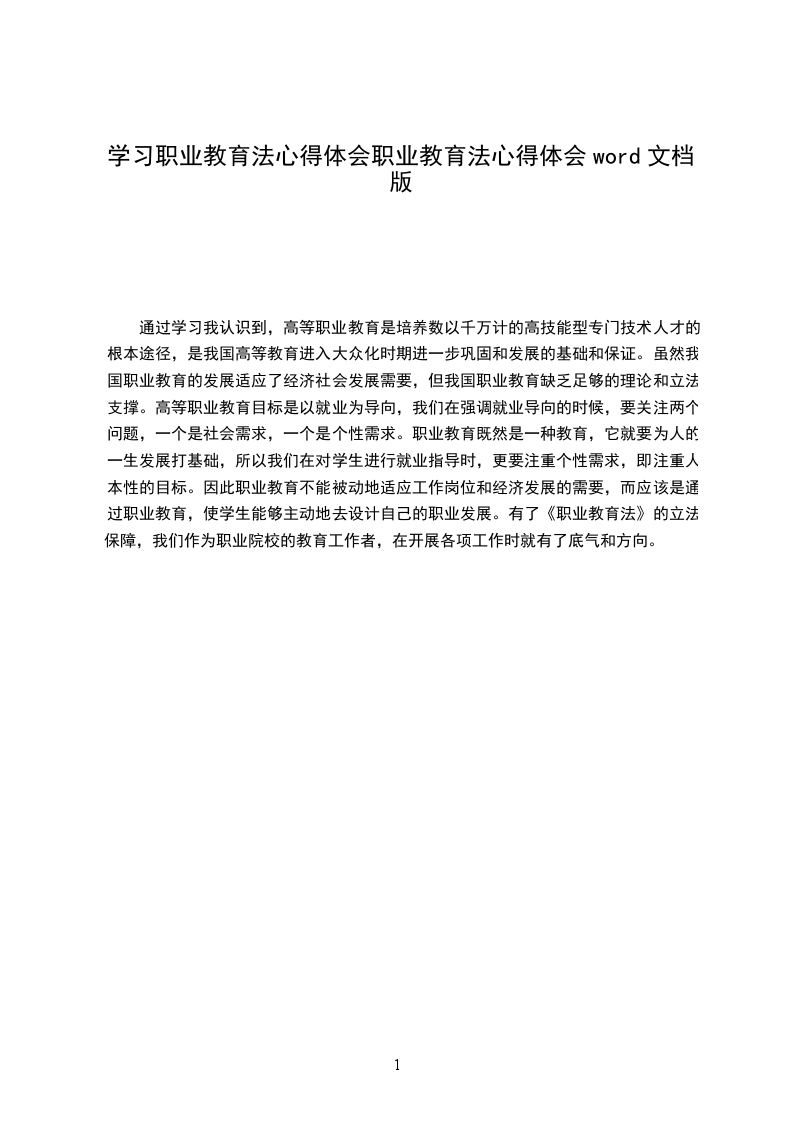 通过学习我认识到,高等职业教育是培养数以千万计的高技能型专门技术人才的根本途径,是我国高等教育进入大众化时期进一步巩固和发展的基础和保证。虽然我国职业教育的发展适应了经济社会发展需要,但我国职业教育缺乏足够的理论和立法支撑。高等职业教育目标是以就业为导向,我们在强调就业导向的时候,要关注两个问题,一个是社会需求,一个是个性需求。职业教育既然是一种教育,它就要为人的一生发展打基础,所以我们在对学生进行就业指导时,更要注重个性需求,即注重人本性的目标。因此职业教育不能被动地适应工作岗位和经济发展的需要,而应该是通过职业教育,使学生能够主动地去设计自己的职业发展。有了《职业教育法》的立法保障,我们作为职业院校的教育工作者,在开展各项工作时就有了底气和方向。