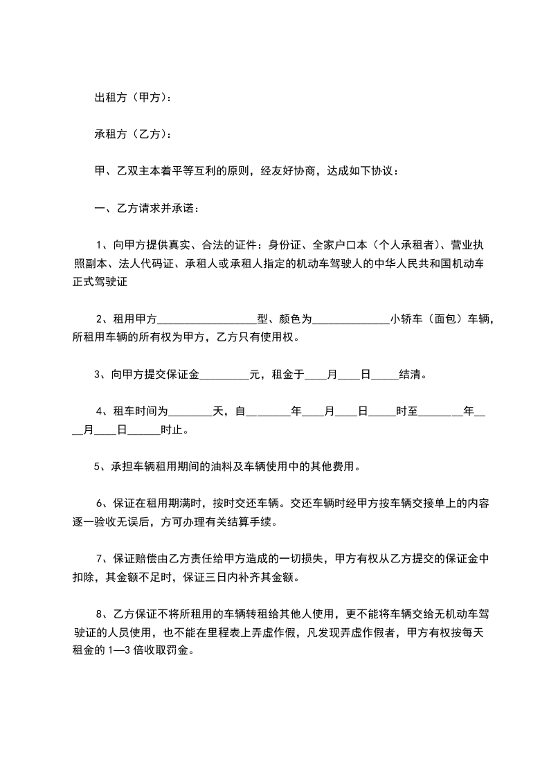 2、租用甲方__________________型、颜色为______________小轿车(面包)车辆,所租用车辆的所有权为甲方,乙方只有使用权。