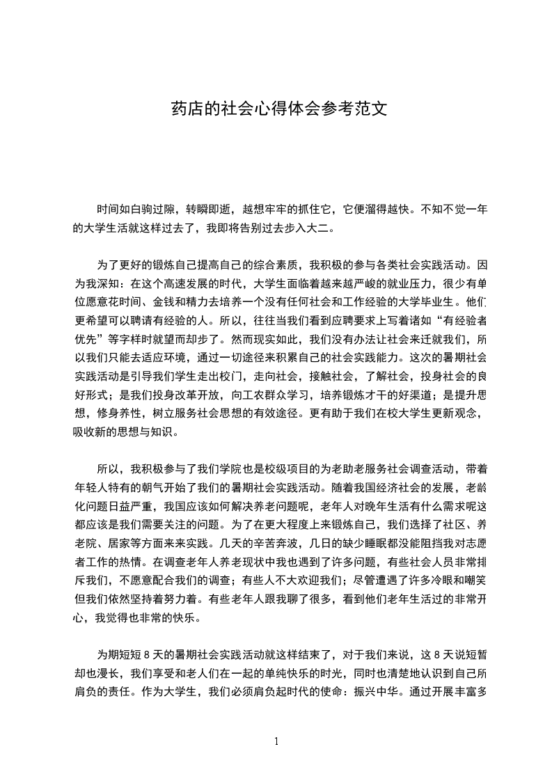 为期短短8天的暑期社会实践活动就这样结束了,对于我们来说,这8天说短暂却也漫长,我们享受和老人们在一起的单纯快乐的时光,同时也清楚地认识到自己所肩负的责任。作为大学生,我们必须肩负起时代的使命:振兴中华。通过开展丰富多彩的社会实践活动,使我逐步了解了社会,开阔了视野,增长了才干,并在社会实践活动中认清了自己的位置,发现了自己的不足,对自身价值能够进行客观评价。这在无形中使我对自己有一个正确的定位,增强了我努力学习的信心和毅力。