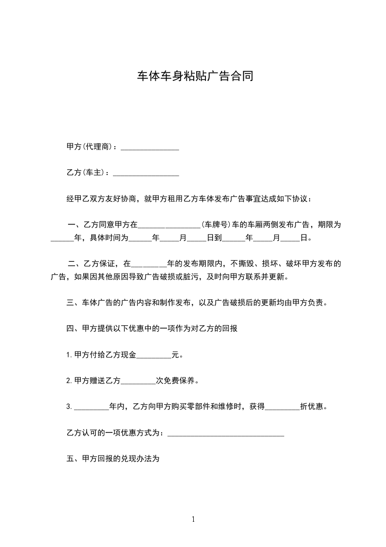 一、乙方同意甲方在________________(车牌号)车的车厢两侧发布广告,期限为______年,具体时间为______年_____月_____日到______年_____月_____日。