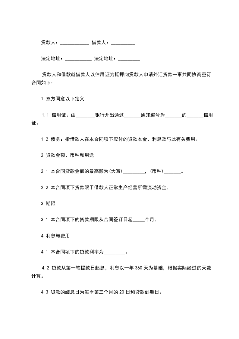 贷款人和借款就借款人以信用证为抵押向贷款人申请外汇贷款一事共同协商签订合同如下: