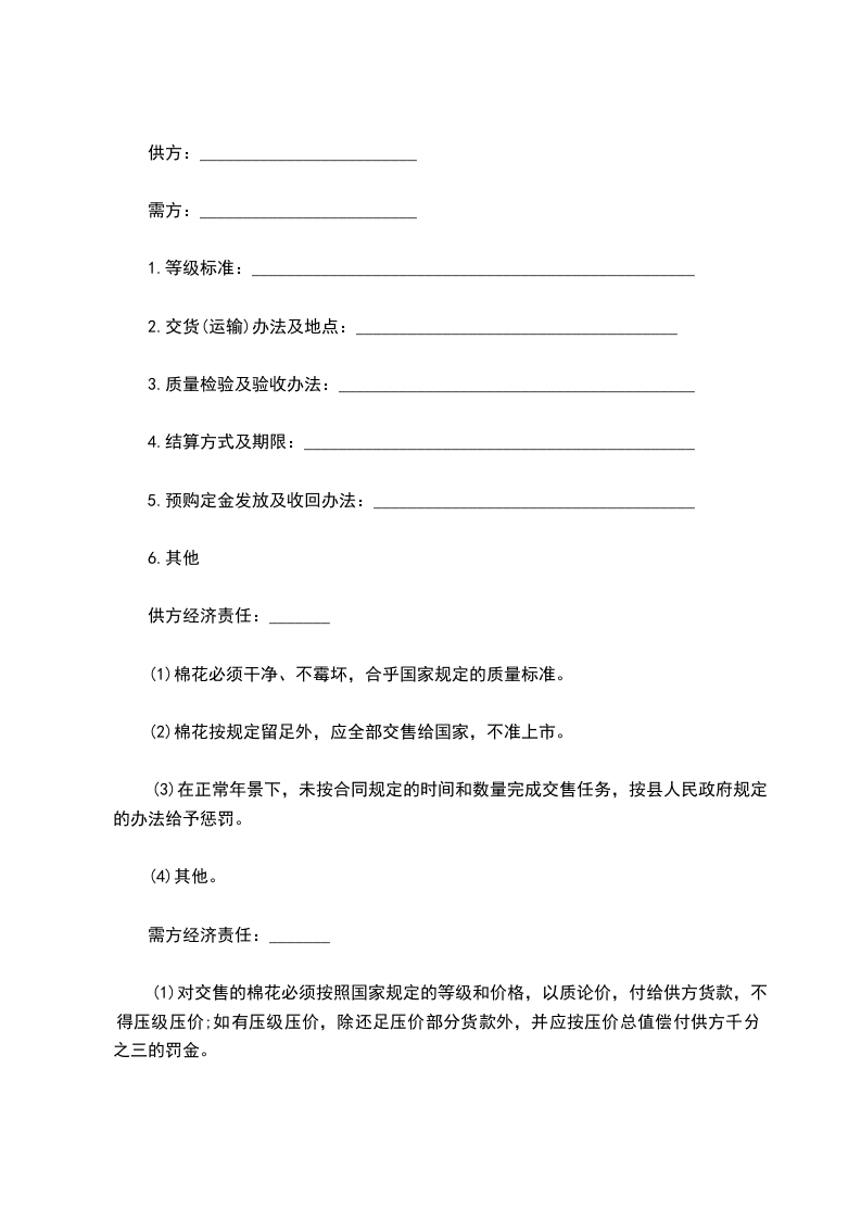第七条 乙方收购籽棉,根据甲方的意愿,按国家政策规定返售棉籽____市斤(或棉油____市斤、棉饼____市斤)。