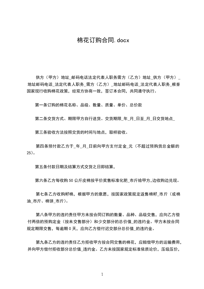 1.乙方拒收甲方按合同交售的棉花,应赔偿甲方的运输费用,并向甲方偿付拒收部分总价值____%违约金。