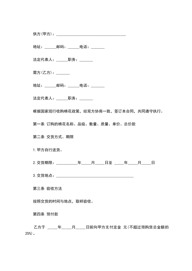 1.甲方未按合同订购的数量、品种、品级交售,应向乙方偿付两倍的预购定金(按未交售部分)和少交部分的总价值____%的违约金。