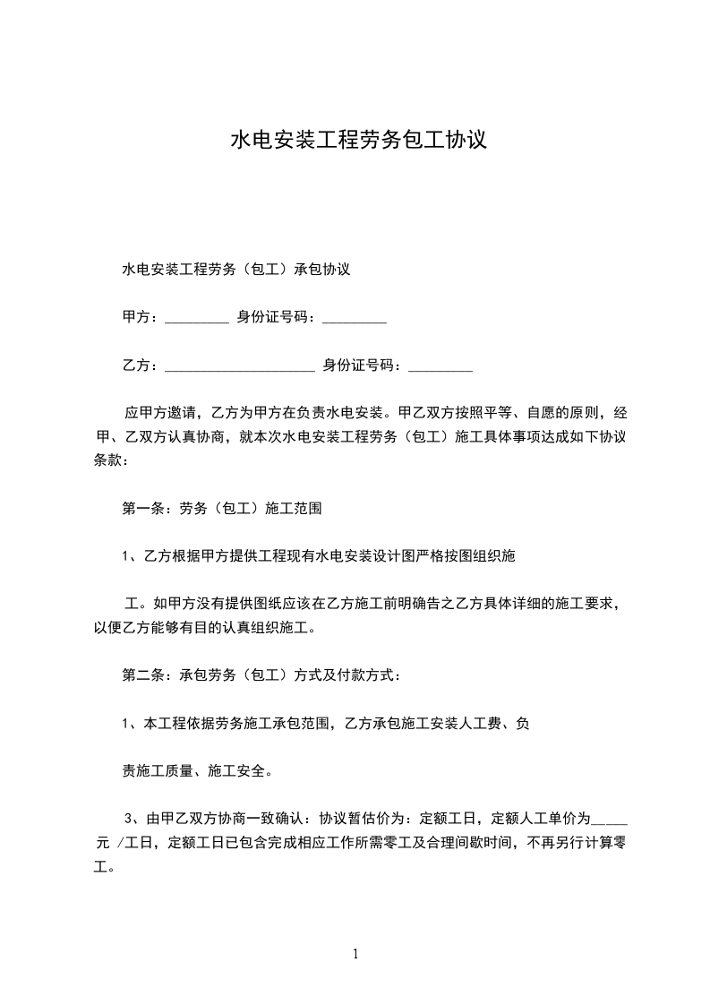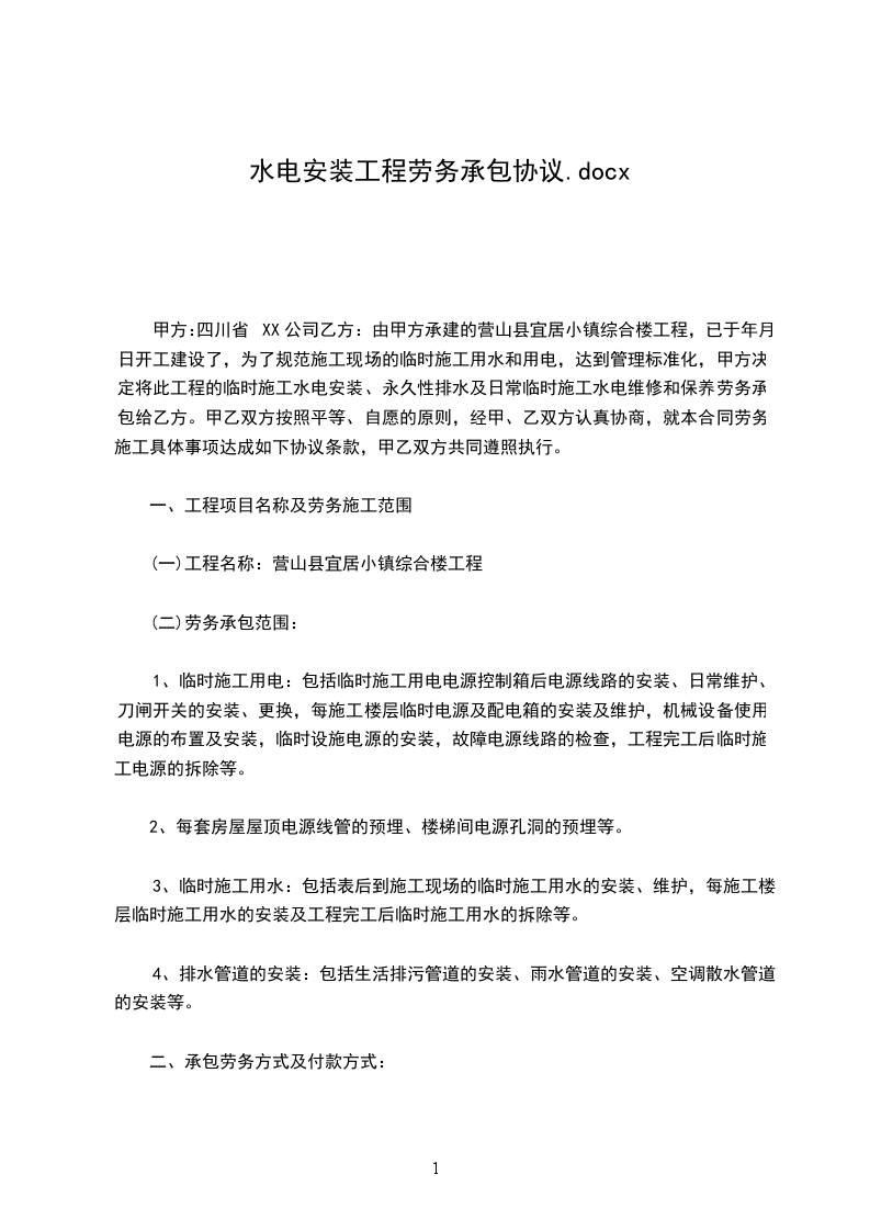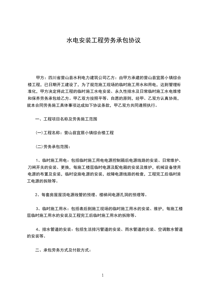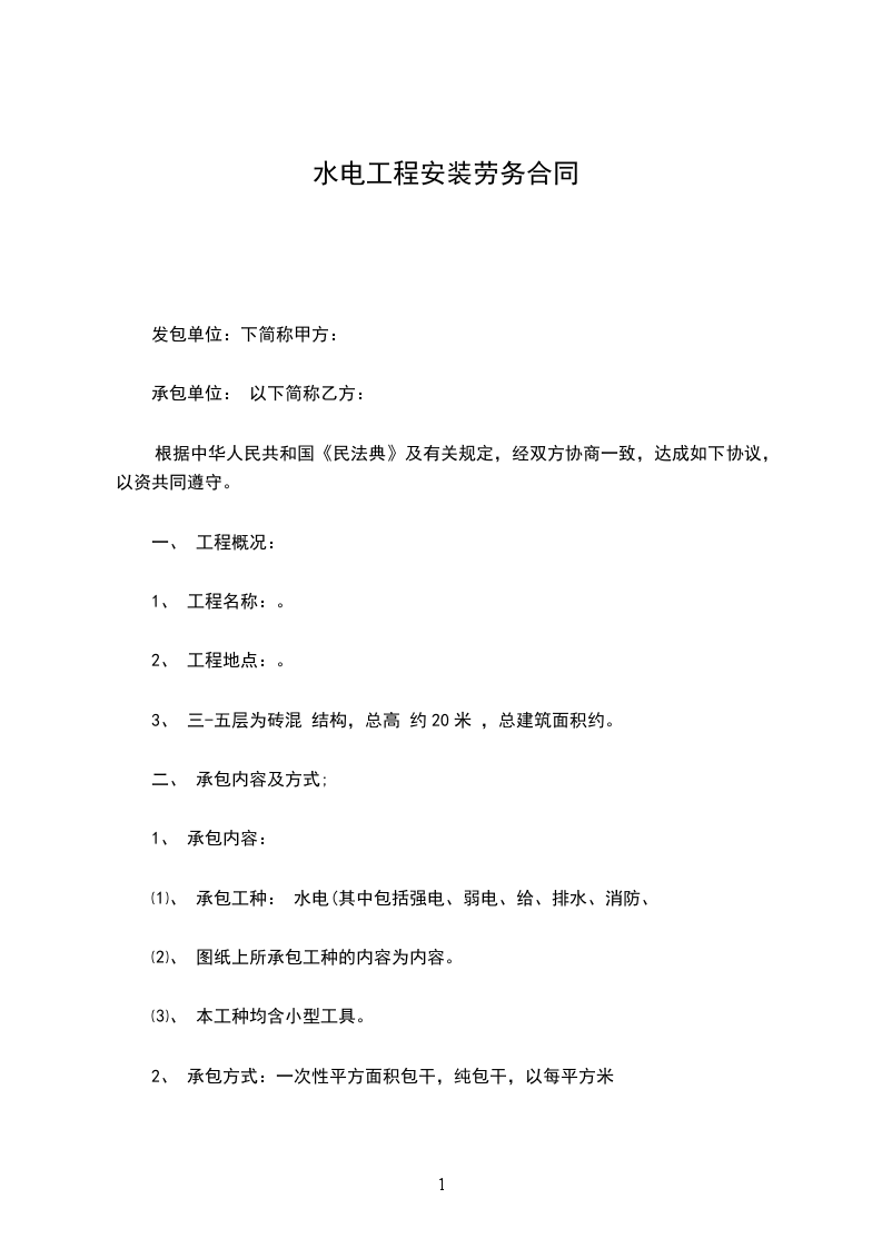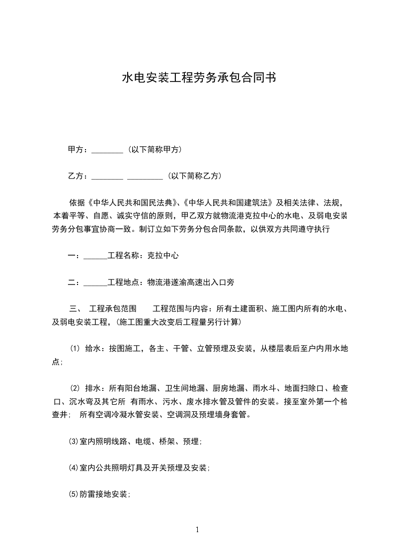 ⑴、 承包工种: 水电(其中包括强电、弱电、给、排水、消防、
