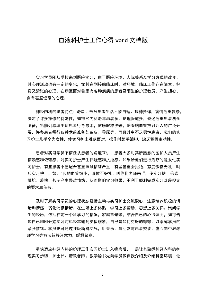 血液科护士工作心得(扩展6)——血液科护士进修心得体会(菁选2篇)