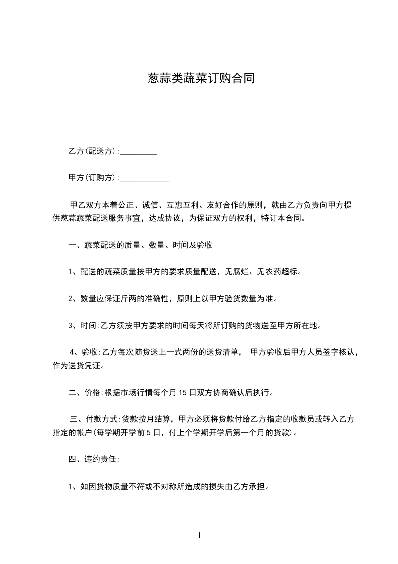 甲乙双方本着公正、诚信、互惠互利、友好合作的原则,就由乙方负责向甲方提供葱蒜蔬菜配送服务事宜,达成协议,为保证双方的权利,特订本合同。