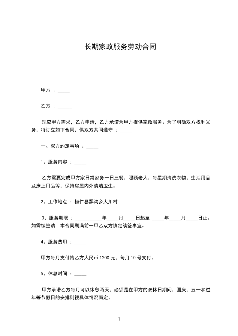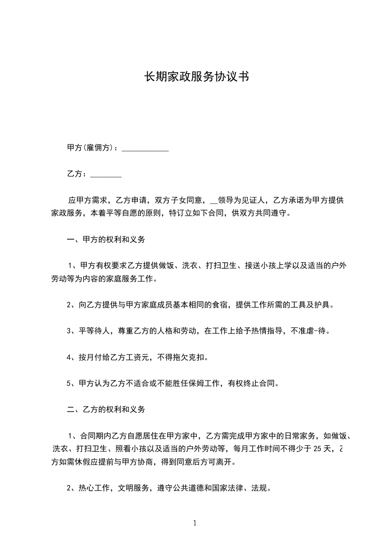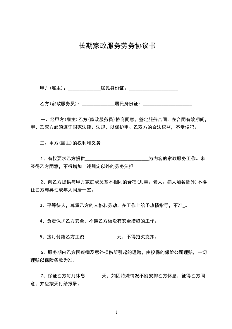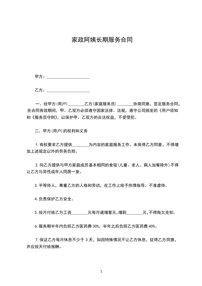九、用户(乙方)需家政服务员工作,并以月工资结算,应同意每周不少于休息一天,如遇法定假日(春节三天,元旦节一天,五一节一天,国庆节一天)休息,工资照付。