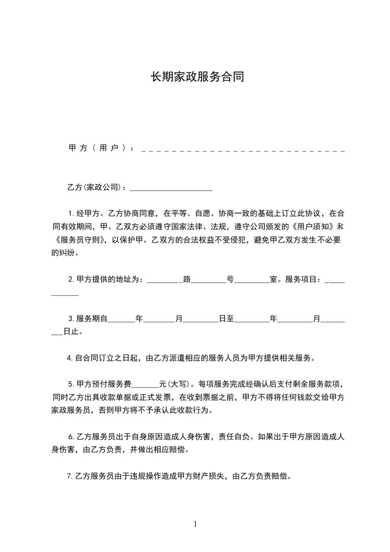 六、家政服务员由于违规操作造成乙方财产损失,由甲方负责赔偿。