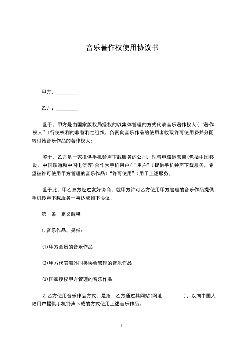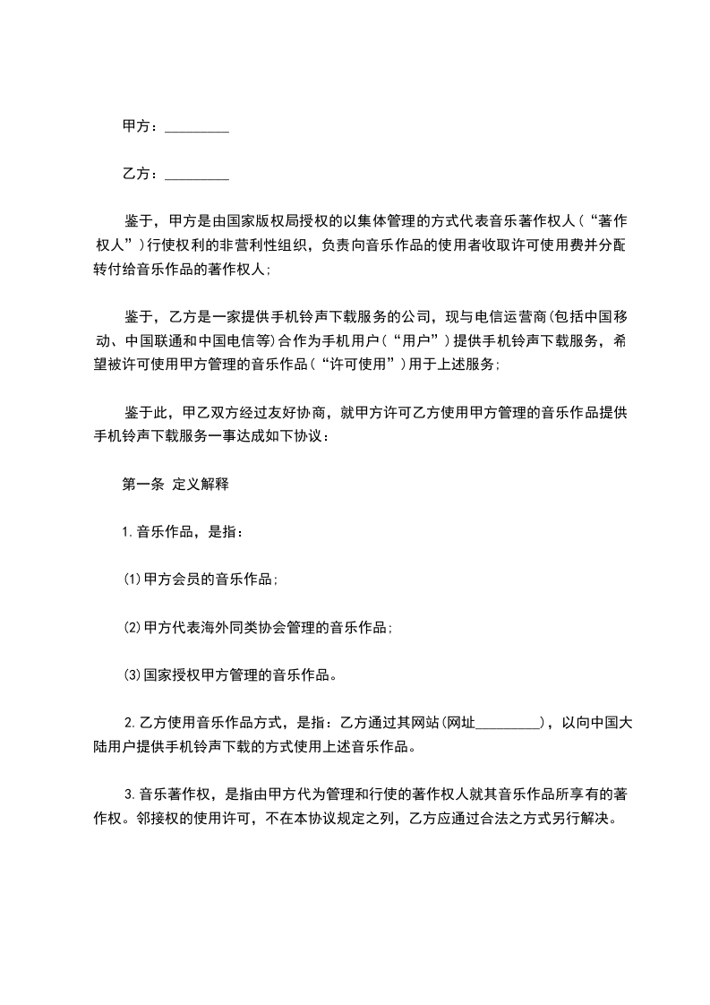 鉴于,乙方是一家提供手机铃声下载服务的公司,现与电信运营商(包括中国移动、中国联通和中国电信等)合作为手机用户(“用户”)提供手机铃声下载服务,希望被许可使用甲方管理的音乐作品(“许可使用”)用于上述服务;