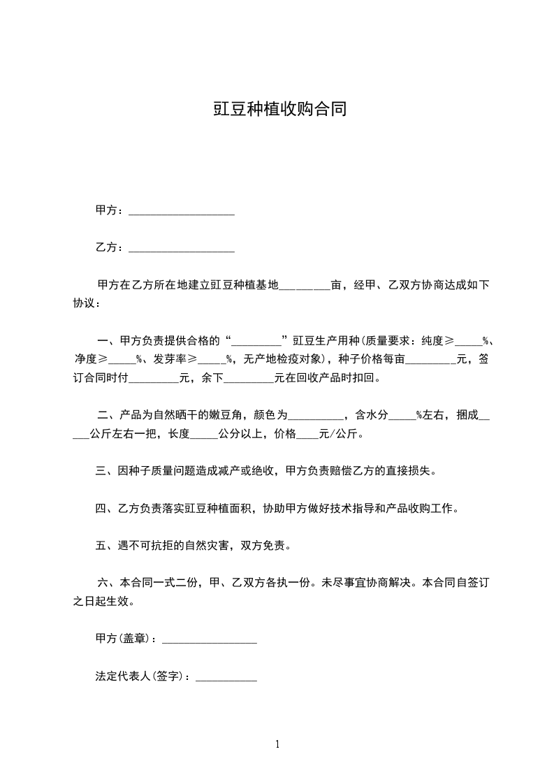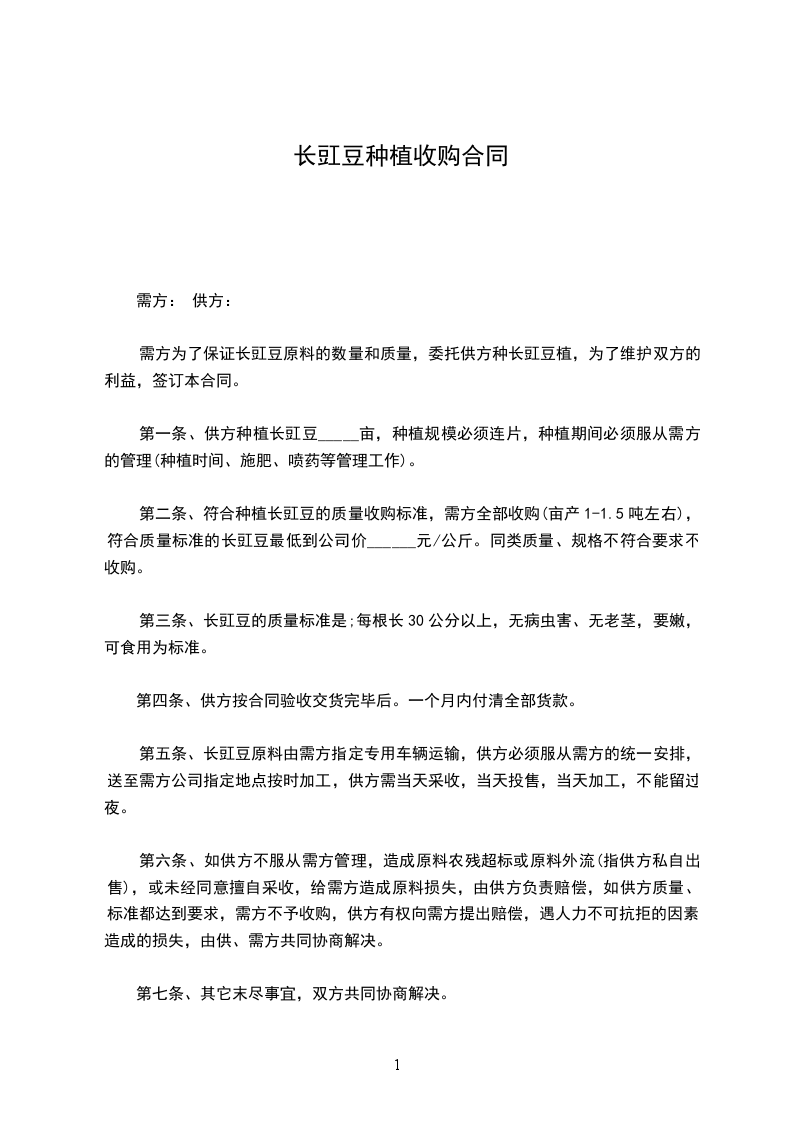 第一条、供方种植长豇豆_____亩,种植规模必须连片,种植期间必须服从需方的管理(种植时间、施肥、喷药等管理工作)。